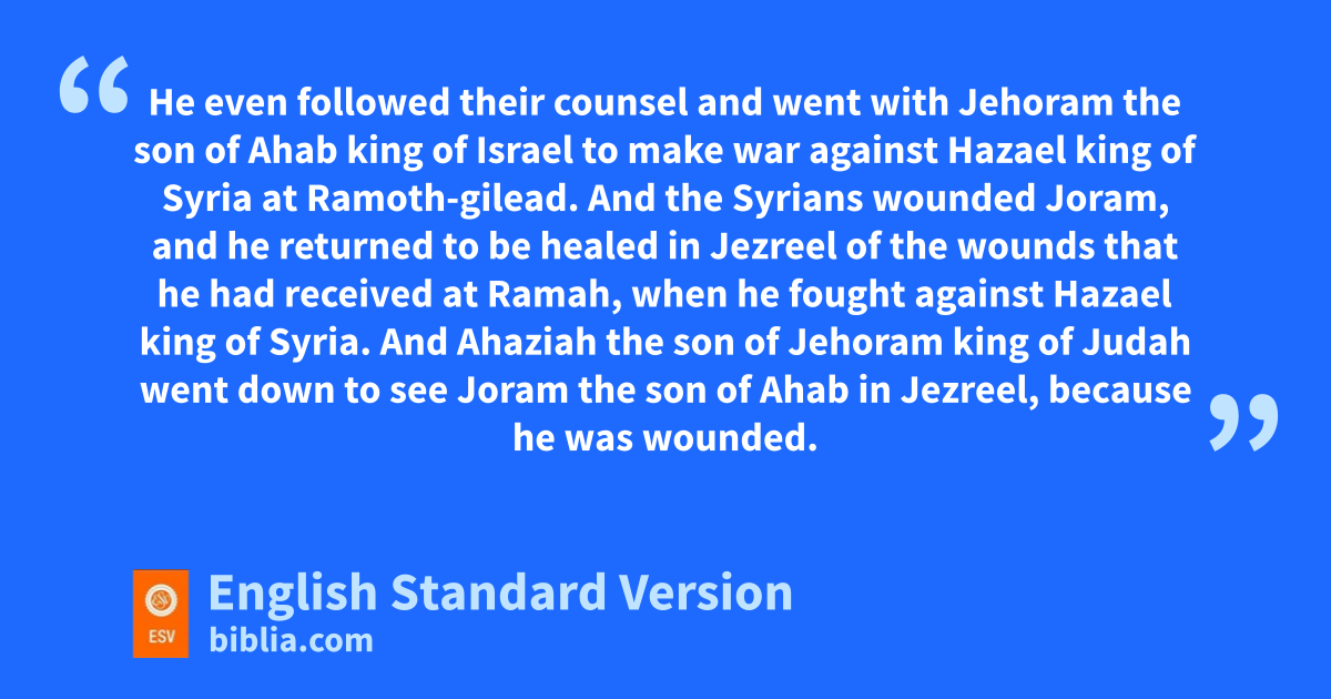22 bAnd the inhabitants of Jerusalem made Ahaziah, his youngest son, king in his place, for the band of men that came with cthe Arabians to the camp had killed all the older sons. So Ahaziah the son of Jehoram king of Judah reigned. 2 Ahaziah was twenty-two1 years old when he began to reign, and he reigned one year in Jerusalem. His mother’s name was Athaliah, dthe granddaughter of Omri. 3 He also walked in the ways of the house of Ahab, for his mother was his counselor in doing wickedly. 4 He did what was evil in the sight of the Lord, as the house of Ahab had done. For after the death of his father they were his counselors, to his undoing. 5 He even followed their counsel and went with Jehoram the son of Ahab king of Israel to make war against Hazael king of Syria at Ramoth-gilead. And the Syrians wounded Joram, 6 and he returned to be healed in Jezreel of the wounds that he had received at Ramah, when he fought against Hazael king of Syria. And Ahaziah the son of Jehoram king of Judah went down to see Joram the son of Ahab in Jezreel, because he was wounded.