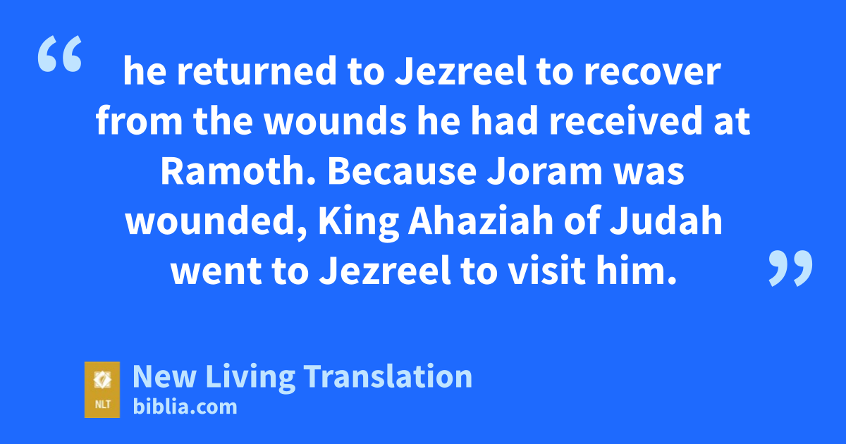 5 Following their evil advice, Ahaziah joined Joram,* the son of King Ahab of Israel, in his war against King Hazael of Aram at Ramoth-gilead. When the Arameans* wounded Joram in the battle, 6 he returned to Jezreel to recover from the wounds he had received at Ramoth.* Because Joram was wounded, King Ahaziah* of Judah went to Jezreel to visit him.