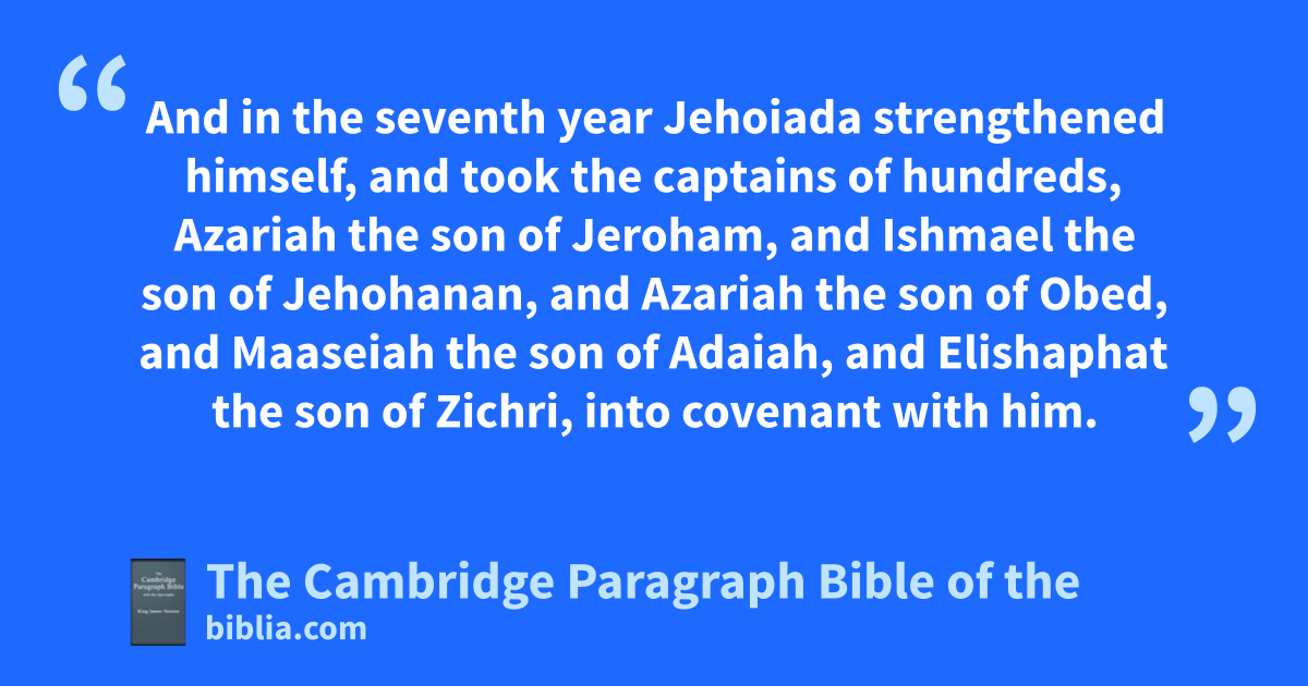 XXIII. * And in the seventh year aJehoiada strengthened himself, and took the captains of hundreds, Azariah the son of Jeroham, and Ishmael the son of Jehohanan, and bAzariah the son of bObed, and Maaseiah the son of Adaiah, and Elishaphat the son of Zichri, into covenant with him. 2 And they went about in Judah, and gathered the Levites out of all the cities of Judah, and the chief of the fathers of cIsrael, and they came to Jerusalem. 3 And all the congregation made a covenant with the king in the house of God. And he said unto them, Behold, the king’s son shall reign, as dthe Lord hath said of the sons of David. 4 This is the thing that ye shall do; A third part of you entering on the sabbath, of the priests and of the Levites, shall be porters of the * doors; 5 and a third part shall be at the king’s house; and a third part at the gate of ethe foundation: and all the people shall be in the courts of the house of the Lord. 6 But let none come into the house of the Lord, save the priests, and fthey that minister of the Levites; they shall go in, for they are holy: but gall the people shall keep the watch of the Lord. 7 And the Levites shall compass the king round about, every man with his weapons in his hand; and whosoever else cometh into the house, he shall be put to death: but be you with the king when he cometh in, and when he goeth out. 8 So the Levites and all Judah did according to all things that Jehoiada the priest had commanded, and took every man his men that were to come in on the sabbath, with them that were to go out on the sabbath: for Jehoiada the priest hdismissed not ithe courses. 9 Moreover Jehoiada the priest delivered to the captains of hundreds spears, and bucklers, and shields, that had been king David’s, which were in the house of God. 10 And he set all the people, every man having his weapon in his hand, from the right * side of the * temple to the left side of the * temple, along by the altar and the * temple, by the king round about. 11 Then they brought out the king’s son, and put upon him the crown, and gave him the Testimony, and made him king. And Jehoiada and his sons anointed him, and said, * God save the king. 12 Now when Athaliah heard the noise of the people krunning and praising the king, she came to the people into the house of the Lord: 13 and she looked, and behold, the king stood at his pillar at the entering in, and the princes and the trumpets by the king: and all the people of the land rejoiced, and sounded with trumpets, also the singers with instruments of musick, and lsuch as taught to sing praise. Then Athaliah rent her clothes, and said, * Treason, Treason. 14 Then Jehoiada the priest brought out the captains of hundreds that were set over the host, and said unto them, Have her forth of the ranges: and whoso followeth her, let him be slain with the sword. For the priest said, Slay her not in the house of the Lord. 15 So they laid hands on her; and when she was come to the entering of the mhorse gate by the king’s house, they slew her there.
