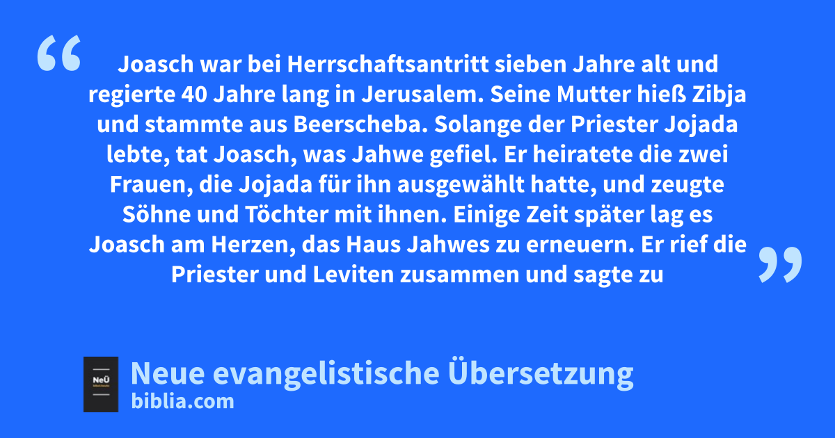 24 1 Joasch war bei Herrschaftsantritt sieben Jahre alt und regierte 40 Jahre lang in Jerusalem. Seine Mutter hieß Zibja und stammte aus Beerscheba. 2 Solange der Priester Jojada lebte, tat Joasch, was Jahwe gefiel. 3 Er heiratete die zwei Frauen, die Jojada für ihn ausgewählt hatte, und zeugte Söhne und Töchter mit ihnen.