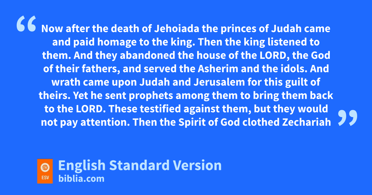 17 Now after the death of Jehoiada the princes of Judah came and paid homage to the king. Then the king listened to them. 18 And they abandoned the house of the Lord, the God of their fathers, and served othe Asherim and the idols. And pwrath came upon Judah and Jerusalem for this guilt of theirs. 19 qYet he sent prophets among them to bring them back to the Lord. rThese testified against them, but they would not pay attention.