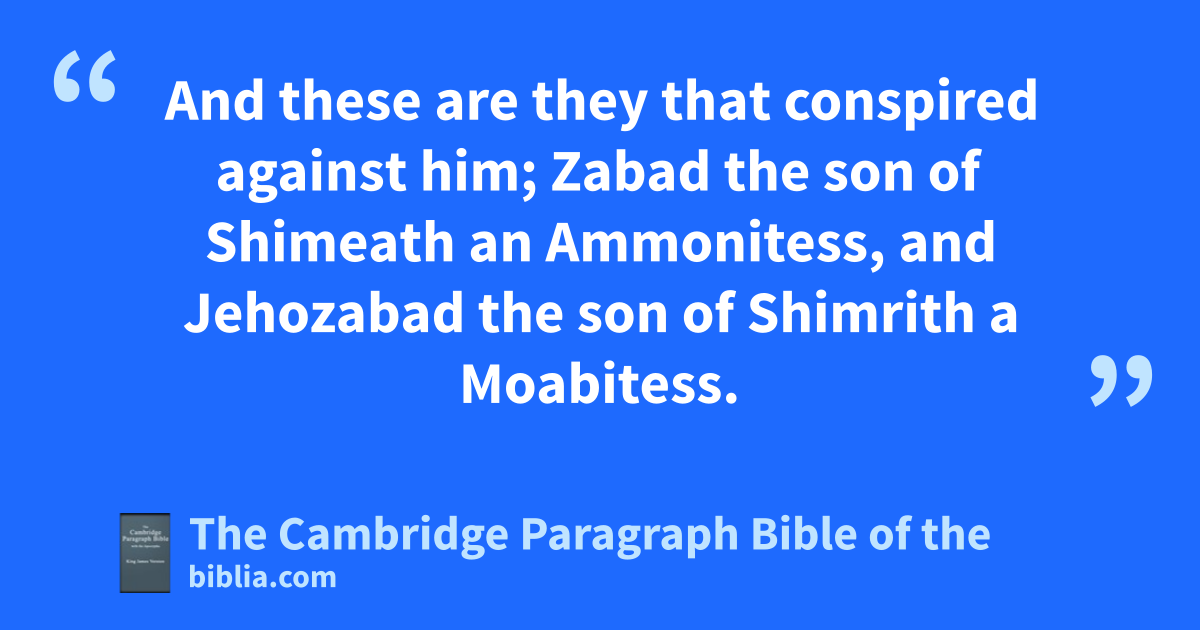 23 * And it came to pass * at the end of the year, that gthe host of Syria came up against him: and they came to Judah and Jerusalem, and destroyed all hthe princes of the people from among the people, and sent all the spoil of them unto the king of * Damascus. 24 For the army of the Syrians icame with a small company of men, and the Lord delivered a very great host into their hand, because they had forsaken the Lord God of their fathers. So jthey executed judgment against Joash. 25 * And when they were departed from him, (for they left him in great kdiseases,) lhis own servants conspired against him for the blood of the msons of Jehoiada the priest, and slew him on his bed, and he died: and they buried him in the city of David, nbut they buried him not in the sepulchres of the kings. 26 And these are they that conspired against him; * Zabad the son of Shimeath an Ammonitess, and Jehozabad the son of * Shimrith a Moabitess. 27 Now concerning his sons, and othe greatness of the burdens laid upon him, and the * repairing of the house of God, behold they are written in the * story of the book of the kings. And Amaziah his son reigned in his stead.