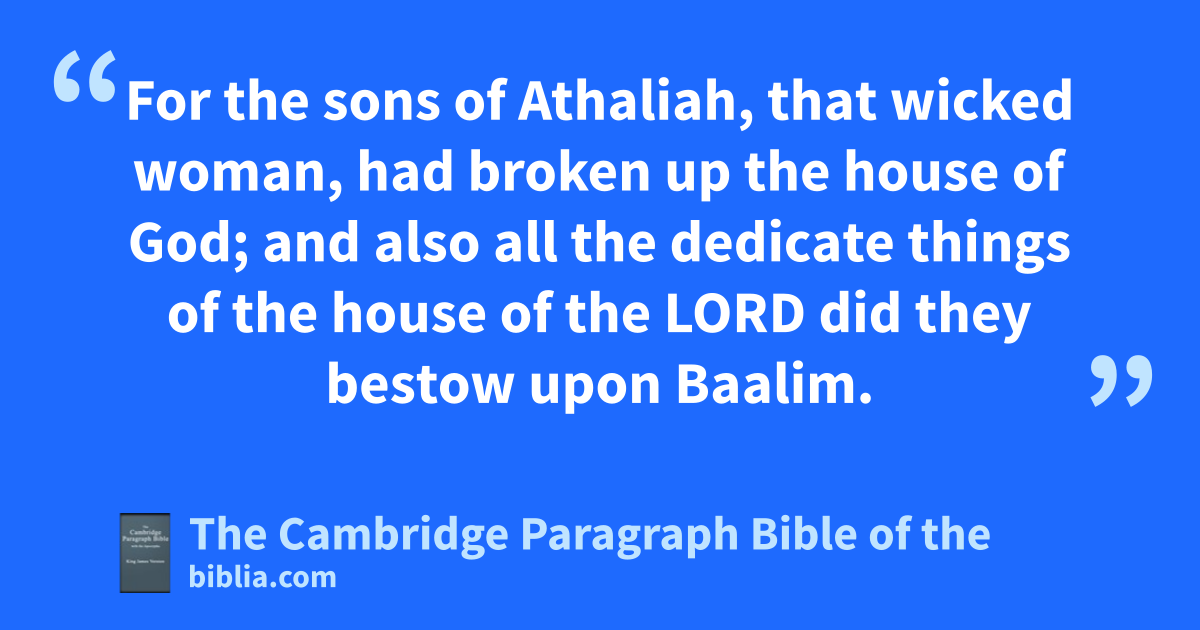 XXIV. * Joash was seven years old when he began to reign, and ahe reigned forty years in Jerusalem. His mother’s name also was Zibiah of Beer-sheba. 2 And Joash bdid that which was right in the sight of the Lord call the days of Jehoiada the priest. 3 And Jehoiada took for him two wives; dand he begat sons and daughters. 4 And it came to pass after this, that Joash ewas minded * to repair the house of the Lord. 5 * And he gathered together the priests and the Levites, and said to them, Go out unto the cities of Judah, and gather of all fIsrael money to repair the house of your God from year to year, and see that ye haste the matter. gHowbeit the Levites hastened it not. 6 And the king called for Jehoiada the chief, and said unto him, Why hast thou not required of the Levites to bring in out of Judah and out of Jerusalem the collection, according to the commandment of hMoses the servant of the Lord, and of the congregation of Israel, for the itabernacle of Witness? 7 For kthe sons of Athaliah, that wicked woman, had broken up the house of God; and also all the ldedicate things of the house of the Lord did they bestow upon Baalim. 8 And at the king’s commandment they made a chest, and set it mwithout at the gate of the house of the Lord. 9 And they made * a proclamation through Judah and Jerusalem, to bring in to the Lord nthe collection that Moses the servant of God laid upon Israel in the wilderness. 10 And all the princes and all the people rejoiced, and brought in, and cast into the chest, until they had made an end. 11 Now it came to pass, that at what time the chest was brought unto the king’s office by the hand of the Levites, and when they saw that there was much money, the king’s scribe and the high priest’s officer came and emptied the chest, and took it, and carried it to his place again. Thus they did day by day, and gathered money in abundance. 12 And the king and Jehoiada gave it to such as did the work of the service of the house of the Lord, and hired masons and carpenters to repair the house of the Lord, and also such as wrought iron and brass to omend the house of the Lord. 13 So the workmen wrought, and * the work was perfected by them, and they set the house of God in his state, and strengthened it. 14 And when they had finished it, they brought the rest of the money before the king and Jehoiada, pwhereof were made vessels for the house of the Lord, even vessels to minister, and * to offer withal, and spoons, and vessels of gold and silver. And they offered burnt offerings in the house of the Lord continually qall the days of Jehoiada.