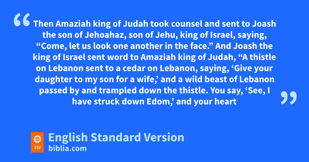 17 wThen Amaziah king of Judah took counsel and sent to Joash the son of Jehoahaz, son of Jehu, king of Israel, saying, “Come, let us look one another in the face.” 18 And Joash the king of Israel sent word to Amaziah king of Judah, x“A thistle on Lebanon sent to a cedar on Lebanon, saying, ‘Give your daughter to my son for a wife,’ and a wild beast of Lebanon passed by and trampled down the thistle. 19 You say, ‘See, I2 have struck down Edom,’ and yyour heart has lifted you up in boastfulness. But now stay at home. Why should you provoke trouble so that you fall, you and Judah with you?”