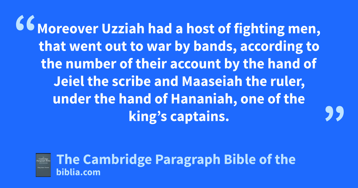 3 aSixteen years old was Uzziah when he began to reign, and he reigned fifty and two years in Jerusalem. His mother’s name also was Jecoliah of Jerusalem. 4 aAnd he did that which was right in the sight of the Lord, according to all that his father Amaziah did. 5 And bhe sought God in the days of Zechariah, who chad understanding * in the visions of God: and as long as he sought the Lord, God made him to prosper. 6 And he went forth and dwarred against the Philistines, and brake down the wall of eGath, and the wall of fJabneh, and the wall of gAshdod, and built cities * about Ashdod, and among the Philistines. 7 And God helped him against the hPhilistines, and against the hArabians that dwelt in Gur-baal, and the iMehunims. 8 And the kAmmonites gave lgifts to Uzziah: and his name * spread abroad even to the entering in of Egypt: for he strengthened himself exceedingly. 9 Moreover Uzziah built towers in Jerusalem at the mcorner gate, and at the nvalley gate, and at othe turning of the wall, and * fortified them. 10 Also he built towers in the desert, and * digged many wells: for he had much cattle, both in the low country, and in pthe plains: qhusbandmen also, and qvinedressers in the mountains, and in * rCarmel: for he loved * husbandry. 11 Moreover Uzziah had a host of fighting men, that went out to war by sbands, according to the number of their account by the hand of Jeiel the scribe and Maaseiah the truler, under the hand of Hananiah, one of the king’s captains. 12 The whole number of the chief of the fathers of the mighty men of valour were two thousand and six hundred. 13 And under their hand was * an army, uthree hundred thousand and seven thousand and five hundred, that made war with mighty power, to help the king against the enemy. 14 And Uzziah prepared for them throughout all the host xshields, and xspears, and yhelmets, and yzhabergeons, and xbows, and * slings to cast stones. 15 And he made in Jerusalem aengines, invented by cunning men, to be on the towers and upon the bbulwarks, to shoot arrows and great stones withal. And his name * spread far abroad; for he was marvellously helped, till he was strong.