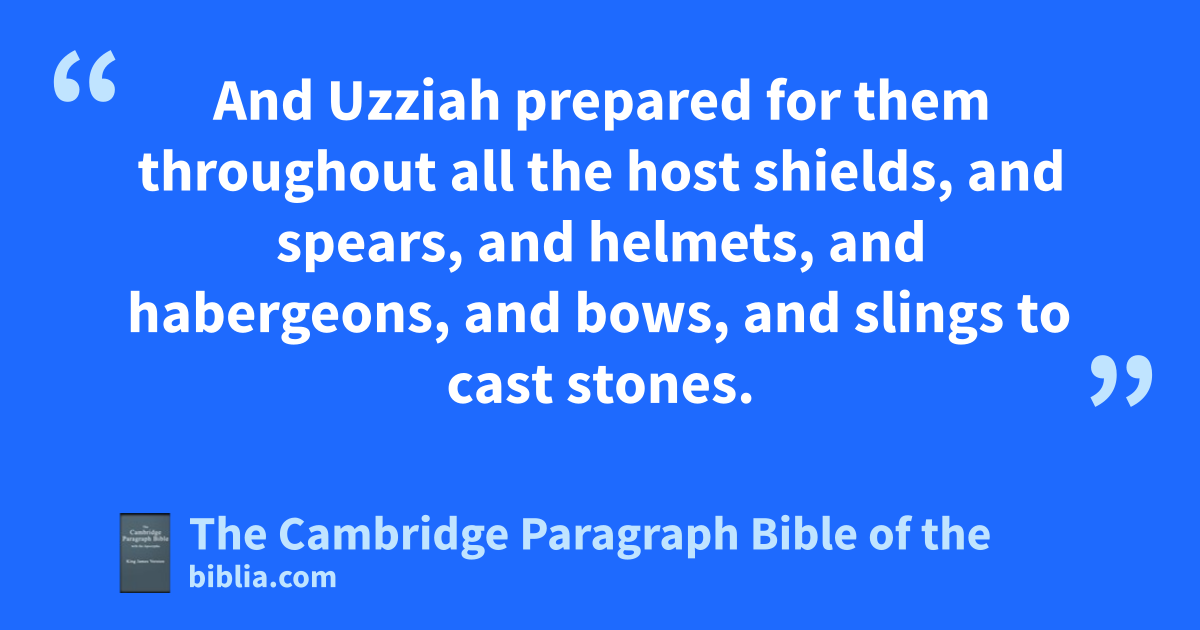 3 aSixteen years old was Uzziah when he began to reign, and he reigned fifty and two years in Jerusalem. His mother’s name also was Jecoliah of Jerusalem. 4 aAnd he did that which was right in the sight of the Lord, according to all that his father Amaziah did. 5 And bhe sought God in the days of Zechariah, who chad understanding * in the visions of God: and as long as he sought the Lord, God made him to prosper. 6 And he went forth and dwarred against the Philistines, and brake down the wall of eGath, and the wall of fJabneh, and the wall of gAshdod, and built cities * about Ashdod, and among the Philistines. 7 And God helped him against the hPhilistines, and against the hArabians that dwelt in Gur-baal, and the iMehunims. 8 And the kAmmonites gave lgifts to Uzziah: and his name * spread abroad even to the entering in of Egypt: for he strengthened himself exceedingly. 9 Moreover Uzziah built towers in Jerusalem at the mcorner gate, and at the nvalley gate, and at othe turning of the wall, and * fortified them. 10 Also he built towers in the desert, and * digged many wells: for he had much cattle, both in the low country, and in pthe plains: qhusbandmen also, and qvinedressers in the mountains, and in * rCarmel: for he loved * husbandry. 11 Moreover Uzziah had a host of fighting men, that went out to war by sbands, according to the number of their account by the hand of Jeiel the scribe and Maaseiah the truler, under the hand of Hananiah, one of the king’s captains. 12 The whole number of the chief of the fathers of the mighty men of valour were two thousand and six hundred. 13 And under their hand was * an army, uthree hundred thousand and seven thousand and five hundred, that made war with mighty power, to help the king against the enemy. 14 And Uzziah prepared for them throughout all the host xshields, and xspears, and yhelmets, and yzhabergeons, and xbows, and * slings to cast stones. 15 And he made in Jerusalem aengines, invented by cunning men, to be on the towers and upon the bbulwarks, to shoot arrows and great stones withal. And his name * spread far abroad; for he was marvellously helped, till he was strong.
