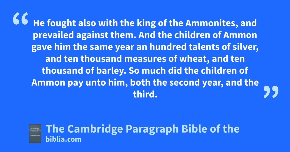 XXVII. * Jotham awas twenty and five years old when he began to reign, and he reigned sixteen years in Jerusalem. His mother’s name also was Jerushah, the daughter of Zadok. 2 And he did that which was right in the sight of the Lord, according to all that his father Uzziah did: howbeit bhe entered not into the temple of the Lord. And the people did yet corruptly. 3 He built the chigh gate of the house of the Lord, and on the wall of d* Ophel he built much. 4 Moreover he built cities in the mountains of Judah, and in the forests he built ecastles and towers. 5 He fought also with the king of the fAmmonites, and prevailed against them. And the children of Ammon gave him the same year an hundred talents of silver, and ten thousand gmeasures of wheat, and ten thousand of barley. * So much did the children of Ammon pay unto him, both the second year, and the third. 6 So Jotham became mighty, hbecause he * prepared his ways before the Lord his God. 7 iNow the rest of the acts of Jotham, and all his wars, and his ways, lo they are written in the book of the kings of Israel and Judah. 8 kHe was five and twenty years old when he began to reign, and reigned sixteen years in Jerusalem. 9 * lAnd Jotham slept with his fathers, and they buried him in the city of David: and Ahaz his son reigned in his stead.