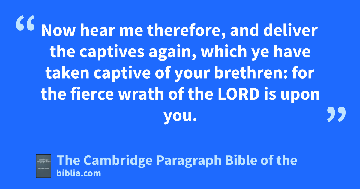 XXVIII. * Ahaz awas twenty years old when he began to reign, and he reigned sixteen years in Jerusalem: but he did not that which was right in the sight of the Lord, like David his father: 2 for he walked in the ways of the kings of Israel, and made also bmolten images for cBaalim. 3 Moreover he * burnt incense in dthe valley of the son of Hinnom, and burnt ehis children in the fire after the abominations of the heathen whom the Lord had cast out before the children of Israel. 4 He sacrificed also and burnt incense in the high places, and on the hills, and under every green tree. 5 * Wherefore the Lord his God delivered him into the hand of the king of Syria; and they esmote him, and carried away a great multitude of them captives, and brought them to * Damascus. And he was also delivered into the hand of the king of Israel, who smote him with a great slaughter. 6 For fPekah the son of Remaliah slew in Judah an hundred and twenty thousand in one day, which were all * valiant men; because they had forsaken the Lord God of their fathers. 7 And Zichri, a mighty man of Ephraim, slew Maaseiah gthe king’s son, and Azrikam gthe governor of the house, and Elkanah that was * next to the king. 8 And the children of Israel carried away captive of their hbrethren two hundred thousand, women, sons, and daughters, and took also away much spoil from them, and brought the spoil to Samaria. 9 But a prophet of the Lord was there, whose name was Oded: and he went out before the host that came to Samaria, and said unto them, Behold, ibecause the Lord God of your fathers was wroth with Judah, he hath delivered them into your hand, and ye have slain them in a rage that jreacheth up unto heaven. 10 And now ye purpose to keep under the children of Judah and Jerusalem for bondmen and bondwomen unto you: but are there not with you, even with you, sins against the Lord your God? 11 Now hear me therefore, and deliver the captives again, which ye have taken captive of your brethren: for the fierce wrath of the Lord is upon you. 12 Then certain of the heads of the children of Ephraim, Azariah the son of Johanan, Berechiah the son of Meshillemoth, and kJehizkiah the son of lShallum, and Amasa the son of Hadlai, stood up against them that came from the war, 13 and said unto them, Ye shall not bring in the captives hither: for whereas we have offended against the Lord already, ye intend to add more to our sins and to our trespass: for our trespass is great, and there is fierce wrath against Israel. 14 So mthe armed men left the captives and the spoil before the princes and all the congregation. 15 And the men nwhich were expressed by name rose up, and took the captives, and with the spoil clothed all that were naked among them, and arrayed them, and shod them, and ogave them to eat and to drink, and panointed them, and carried all the feeble of them upon asses, and brought them to Jericho, qthe city of palm trees, to their brethren: then they returned to Samaria.