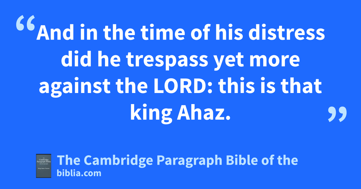 XXVIII. * Ahaz awas twenty years old when he began to reign, and he reigned sixteen years in Jerusalem: but he did not that which was right in the sight of the Lord, like David his father: 2 for he walked in the ways of the kings of Israel, and made also bmolten images for cBaalim. 3 Moreover he * burnt incense in dthe valley of the son of Hinnom, and burnt ehis children in the fire after the abominations of the heathen whom the Lord had cast out before the children of Israel. 4 He sacrificed also and burnt incense in the high places, and on the hills, and under every green tree. 5 * Wherefore the Lord his God delivered him into the hand of the king of Syria; and they esmote him, and carried away a great multitude of them captives, and brought them to * Damascus. And he was also delivered into the hand of the king of Israel, who smote him with a great slaughter. 6 For fPekah the son of Remaliah slew in Judah an hundred and twenty thousand in one day, which were all * valiant men; because they had forsaken the Lord God of their fathers. 7 And Zichri, a mighty man of Ephraim, slew Maaseiah gthe king’s son, and Azrikam gthe governor of the house, and Elkanah that was * next to the king. 8 And the children of Israel carried away captive of their hbrethren two hundred thousand, women, sons, and daughters, and took also away much spoil from them, and brought the spoil to Samaria. 9 But a prophet of the Lord was there, whose name was Oded: and he went out before the host that came to Samaria, and said unto them, Behold, ibecause the Lord God of your fathers was wroth with Judah, he hath delivered them into your hand, and ye have slain them in a rage that jreacheth up unto heaven. 10 And now ye purpose to keep under the children of Judah and Jerusalem for bondmen and bondwomen unto you: but are there not with you, even with you, sins against the Lord your God? 11 Now hear me therefore, and deliver the captives again, which ye have taken captive of your brethren: for the fierce wrath of the Lord is upon you. 12 Then certain of the heads of the children of Ephraim, Azariah the son of Johanan, Berechiah the son of Meshillemoth, and kJehizkiah the son of lShallum, and Amasa the son of Hadlai, stood up against them that came from the war, 13 and said unto them, Ye shall not bring in the captives hither: for whereas we have offended against the Lord already, ye intend to add more to our sins and to our trespass: for our trespass is great, and there is fierce wrath against Israel. 14 So mthe armed men left the captives and the spoil before the princes and all the congregation. 15 And the men nwhich were expressed by name rose up, and took the captives, and with the spoil clothed all that were naked among them, and arrayed them, and shod them, and ogave them to eat and to drink, and panointed them, and carried all the feeble of them upon asses, and brought them to Jericho, qthe city of palm trees, to their brethren: then they returned to Samaria.