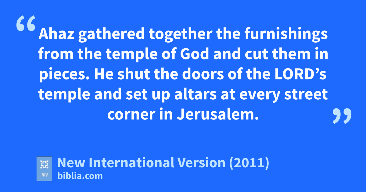 24 Ahaz gathered together the furnishingss from the temple of Godt and cut them in pieces. He shut the doorsu of the Lord’s temple and set up altarsv at every street corner in Jerusalem. 25 In every town in Judah he built high places to burn sacrifices to other gods and aroused the anger of the Lord, the God of his ancestors.