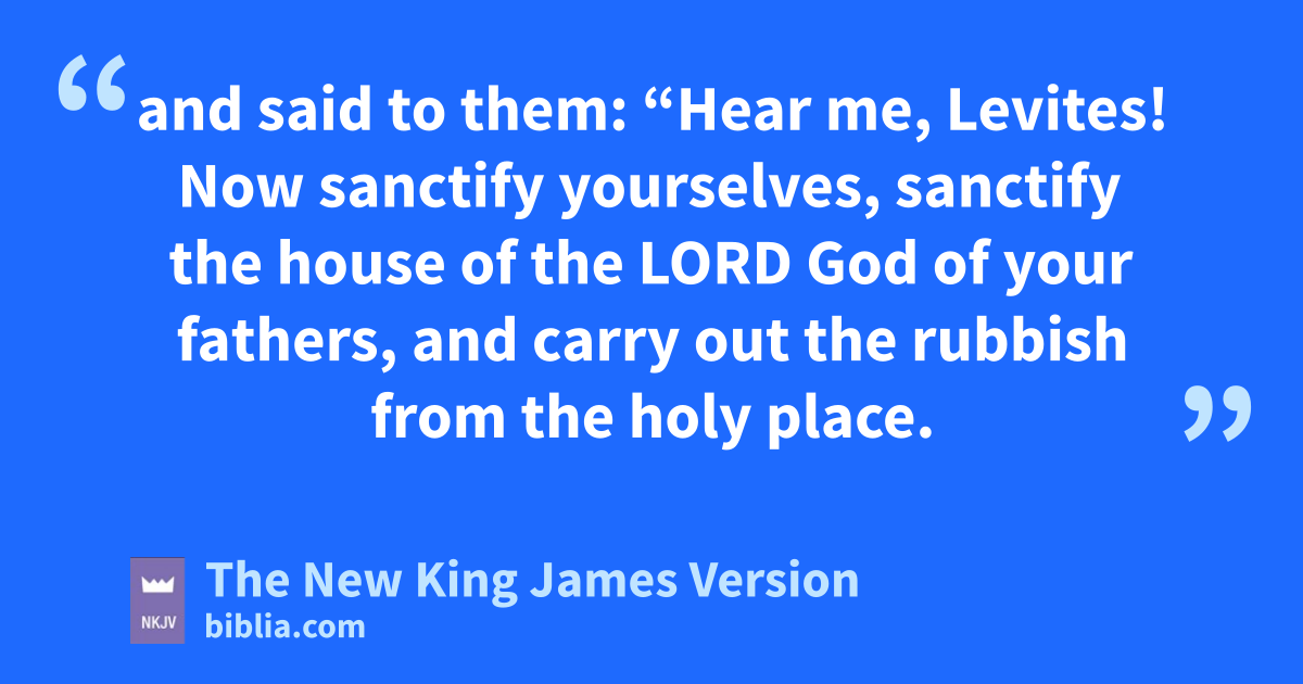 3 In the first year of his reign, in the first month, he bopened the doors of the house of the Lord and repaired them. 4 Then he brought in the priests and the Levites, and gathered them in the East Square, 5 and said to them: “Hear me, Levites! Now 2sanctify yourselves, csanctify the house of the Lord God of your fathers, and carry out the rubbish from the holy place. 6 For our fathers have trespassed and done evil in the eyes of the Lord our God; they have forsaken Him, have dturned their faces away from the 3dwelling place of the Lord, and turned their backs on Him. 7 eThey have also shut up the doors of the vestibule, put out the lamps, and have not burned incense or offered burnt offerings in the holy place to the God of Israel. 8 Therefore the fwrath of the Lord fell upon Judah and Jerusalem, and He has ggiven them up to trouble, to desolation, and to hjeering, as you see with your ieyes. 9 For indeed, because of this jour fathers have fallen by the sword; and our sons, our daughters, and our wives are in captivity.
