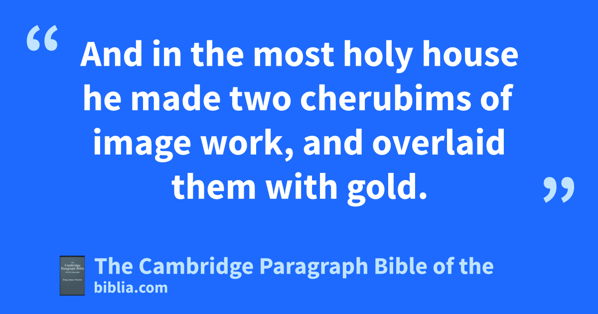 10 And in the mmost holy house he made ptwo cherubims * of image work, and overlaid them with gold. 11 And the wings of the cherubims were twenty cubits long: one wing of the one cherub was five cubits, reaching to the wall of the house: and the other wing was likewise five cubits, reaching to the wing of the other cherub. 12 And one wing of the other cherub was five cubits, reaching to the wall of the house: and the other wing was five cubits also, joining to the wing of the other cherub. 13 The wings of these cherubims spread themselves forth twenty cubits: and they stood on their feet, and their faces were * inward.