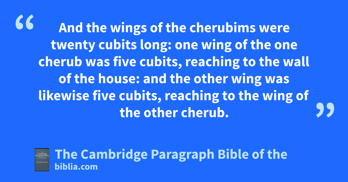 10 And in the mmost holy house he made ptwo cherubims * of image work, and overlaid them with gold. 11 And the wings of the cherubims were twenty cubits long: one wing of the one cherub was five cubits, reaching to the wall of the house: and the other wing was likewise five cubits, reaching to the wing of the other cherub. 12 And one wing of the other cherub was five cubits, reaching to the wall of the house: and the other wing was five cubits also, joining to the wing of the other cherub. 13 The wings of these cherubims spread themselves forth twenty cubits: and they stood on their feet, and their faces were * inward.