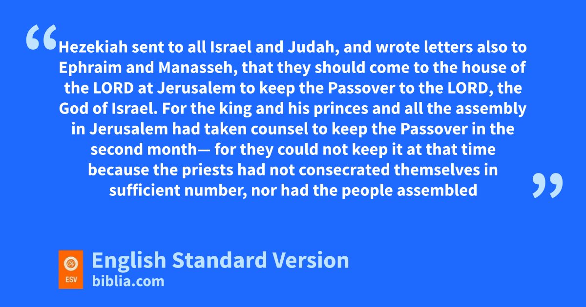 30 Hezekiah sent to all Israel and Judah, and wrote letters also to Ephraim and Manasseh, that they should come to the house of the Lord at Jerusalem to keep the Passover to the Lord, the God of Israel. 2 For the king and his princes and all the assembly in Jerusalem had taken counsel to keep the Passover ain the second month— 3 for they could not keep it bat that time cbecause the priests had not consecrated themselves in sufficient number, nor had the people assembled in Jerusalem— 4 and the plan seemed right to the king and all the assembly. 5 So they decreed to make a proclamation throughout all Israel, dfrom Beersheba to Dan, that the people should come and keep the Passover to the Lord, the God of Israel, at Jerusalem, for they had not kept it as often as prescribed. 6 eSo couriers went throughout all Israel and Judah with letters from the king and his princes, as the king had commanded, saying, “O people of Israel, freturn to the Lord, the God of Abraham, Isaac, and Israel, that he may turn again to the remnant of you who have escaped from the hand of gthe kings of Assyria. 7 hDo not be like your fathers and your brothers, who were faithless to the Lord God of their fathers, so that he made them a desolation, as you see. 8 iDo not now be stiff-necked as your fathers were, but yield yourselves to the Lord and come to his sanctuary, which he has consecrated forever, and serve the Lord your God, jthat his fierce anger may turn away from you. 9 For fif you return to the Lord, your brothers and your children kwill find compassion with their captors and return to this land. For lthe Lord your God is gracious and merciful and will not turn away his face from you, mif you return to him.”