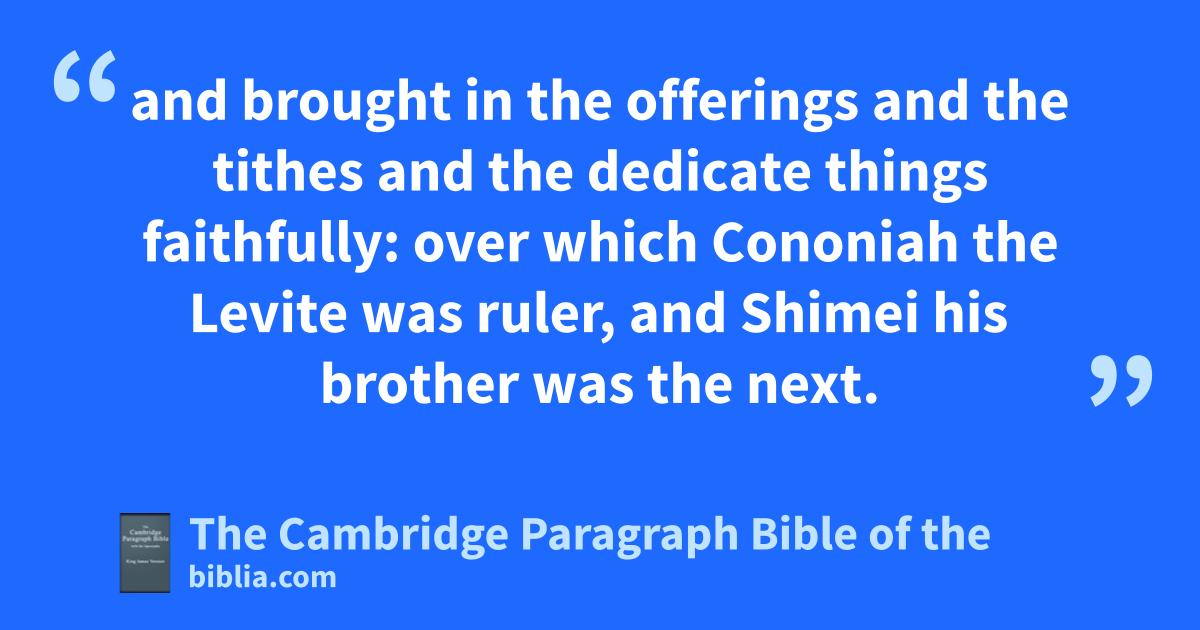 XXXI. Now when all this was finished, all Israel that were * present went out to the cities of Judah, and abrake the * images in pieces, and cut down the groves, and threw down the high places and the altars out of all Judah and Benjamin, in Ephraim also and Manasseh, * until they had utterly destroyed them all. Then all the children of Israel returned, every man to his possession, into their own cities. 2 And Hezekiah appointed bthe courses of the priests and the Levites after their courses, every man according to his service, the priests and Levites cfor burnt offerings and for peace offerings, to minister, and to give thanks, and to praise in the gates of the tents of the Lord. 3 He appointed also the king’s portion of his substance for the burnt offerings, to wit, for the dmorning and evening burnt offerings, and the burnt offerings for the esabbaths, and for the fnew moons, and for the gset feasts, as it is written in the law of the Lord. 4 Moreover he commanded the people that dwelt in Jerusalem to give the hportion of the priests and the Levites, that they might be iencouraged in jthe law of the Lord. 5 And as soon as the commandment * came abroad, the children of Israel brought in abundance the firstfruits kof corn, wine, and oil, and * honey, and of all the increase of the field; and the tithe of all things brought they in abundantly. 6 And concerning the children of Israel and Judah, that dwelt in the cities of Judah, they also brought in the tithe of oxen and sheep, and the ltithe of holy things which were consecrated unto the Lord their God, and laid them * by heaps. 7 In the third month they began to lay the foundation of the heaps, and finished them in the seventh month. 8 And when Hezekiah and the princes came and saw the heaps, they blessed the Lord, and his people Israel. 9 Then Hezekiah questioned with the priests and the Levites concerning the heaps. 10 And mAzariah the chief priest of nthe house of Zadok answered him, and said, Since the people began to bring the offerings into the house of the Lord, we have had enough to eat, and have left plenty: for othe Lord hath blessed his people; and that which is left is this great store. 11 Then Hezekiah commanded to prepare * chambers in the house of the Lord; and they prepared them, 12 and brought in pthe offerings and the tithes and qthe dedicate things faithfully: rover which Cononiah the Levite was ruler, and sShimei his brother was the next. 13 And sJehiel, and Azaziah, and Nahath, and Asahel, and Jerimoth, and Jozabad, and Eliel, and Ismachiah, and sMahath, and Benaiah, were overseers * under the hand of Cononiah and sShimei his brother, at the commandment of Hezekiah the king, and tAzariah the ruler of the house of God. 14 And Kore the son of Imnah the Levite, the porter toward the east, was over the freewill offerings of God, to distribute pthe oblations of the Lord, and uthe most holy things. 15 And * next him were sEden, and Miniamin, and Jeshua, and sShemaiah, Amariah, and Shecaniah, in xthe cities of the priests, in their * set office, to give to their brethren by courses, as well to the great as to the small: 16 beside their genealogy of males, from three years old and upward, even unto every one that entereth into the house of the Lord, his ydaily portion for their service in their charges according to their courses; 17 both to the genealogy of the priests by the house of their fathers, and the Levites zfrom twenty years old and upward, in their charges by their courses; 18 and to the genealogy of all their little ones, their wives, and their sons, and their daughters, through all the congregation: for in their * set office they sanctified themselves in holiness: 19 also of the sons of Aaron the priests, which were in athe fields of the suburbs of their cities, in every several city, the men bthat were expressed by name, to give portions to all the males among the priests, and to all that were reckoned by genealogies among the Levites. 20 And thus did Hezekiah throughout all Judah, and cwrought that which was good and right and truth before the Lord his God. 21 And in every work that he began in the service of the house of God, and in the law, and in the commandments, to seek his God, he did it with all his heart, and prospered.