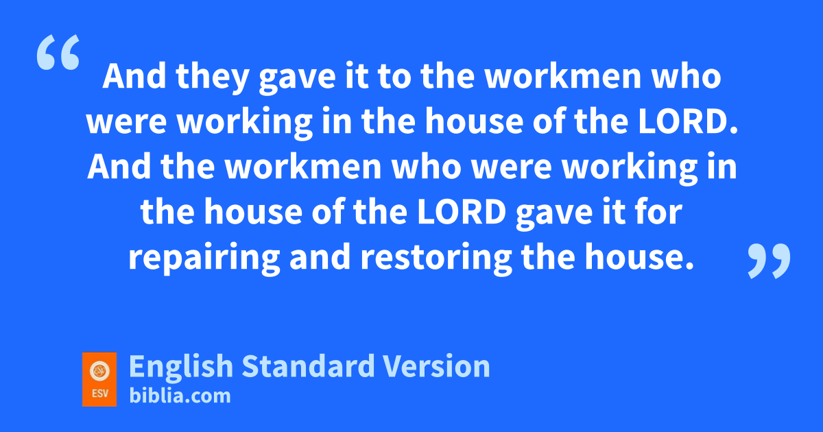 8 sNow in the eighteenth year of his reign, when he had cleansed the land and the house, he sent Shaphan the son of Azaliah, and Maaseiah the tgovernor of the city, and Joah the son of Joahaz, uthe recorder, to repair the house of the Lord his God. 9 They came to vHilkiah the high priest and gave him the money that had been brought into the house of God, which the Levites, the keepers of the threshold, had collected from qManasseh and Ephraim and from all the remnant of Israel and from all Judah and Benjamin and from the inhabitants of Jerusalem. 10 And they gave it to the workmen who were working in the house of the Lord. And the workmen who were working in the house of the Lord gave it for repairing and restoring the house. 11 They gave it to the carpenters and the builders to buy quarried stone, and timber for binders and wbeams for the buildings that the kings of Judah had let go to ruin. 12 And the men did the work faithfully. Over them were set Jahath and Obadiah the Levites, of the sons of Merari, and Zechariah and Meshullam, of the sons of the Kohathites, to have oversight. xThe Levites, all who were skillful with instruments of music, 13 were over ythe burden-bearers and directed all who did work in every kind of service, and some of the Levites were scribes and officials and gatekeepers.