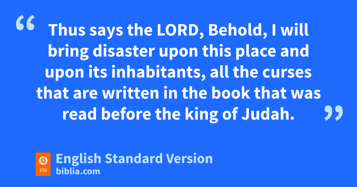 22 So Hilkiah and those whom the king had sent3 went to Huldah the prophetess, the wife of Shallum the son of Tokhath, son of Hasrah, keeper of the wardrobe (now she lived in Jerusalem in the Second Quarter) and spoke to her to that effect. 23 And she said to them, “Thus says the Lord, the God of Israel: ‘Tell the man who sent you to me, 24 Thus says the Lord, Behold, I will bring disaster upon this place and upon its inhabitants, all the curses that are written in the book that was read before the king of Judah. 25 Because they have forsaken me and bhave made offerings to other gods, that they might provoke me to anger with all the works of their hands, therefore amy wrath will be poured out on this place and will not be quenched. 26 But to the king of Judah, who sent you to inquire of the Lord, thus shall you say to him, Thus says the Lord, the God of Israel: Regarding the words that you have heard, 27 because your heart was tender and you humbled yourself before God when you heard his words against this place and its inhabitants, and you have humbled yourself before me and have torn your clothes and wept before me, I also have heard you, declares the Lord. 28 Behold, I will gather you to your fathers, and you shall be gathered to your grave in peace, and your eyes shall not see all the disaster that I will bring upon this place and its inhabitants.’ ” And they brought back word to the king.