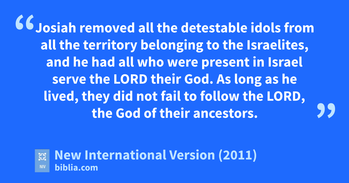 33 Josiah removed all the detestableu idols from all the territory belonging to the Israelites, and he had all who were present in Israel serve the Lord their God. As long as he lived, they did not fail to follow the Lord, the God of their ancestors.