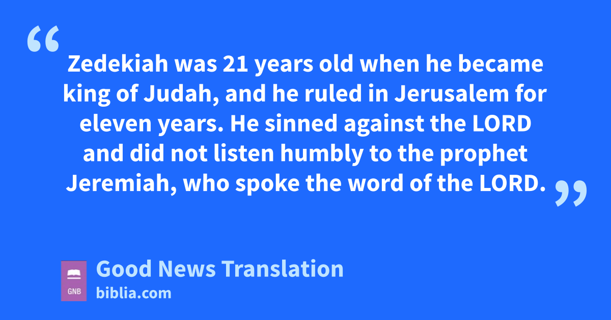 11 *Zedekiah was 21 years old when he became king of Judah, and he ruled in Jerusalem for eleven years. 12He sinned against the Lord and did not listen humbly to the prophet Jeremiah, who spoke the word of the Lord.