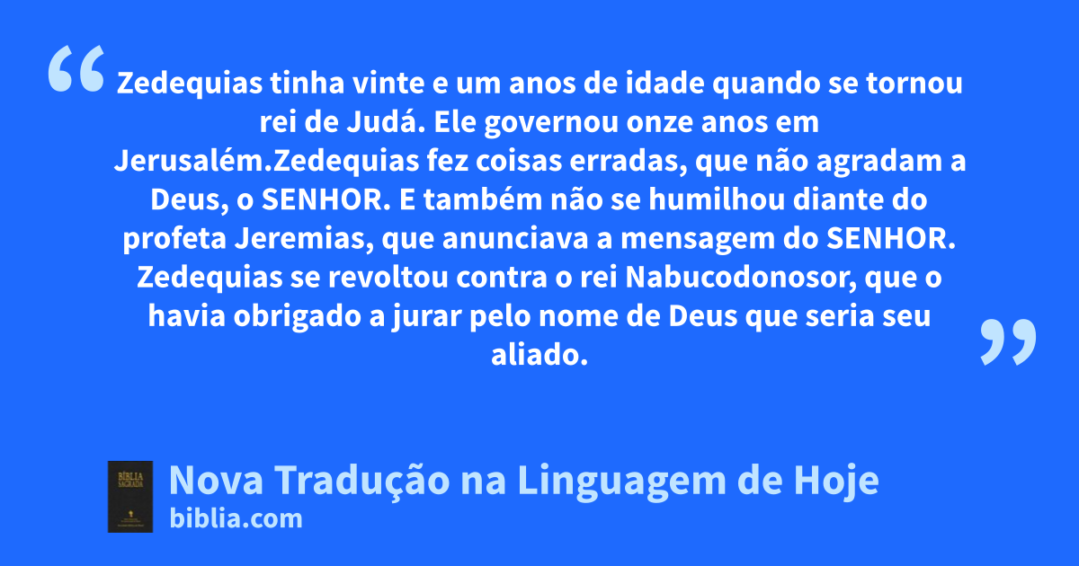 11 Zedequias tinha vinte e um anos de idade quando se tornou rei de Judá. Ele governou onze anos em Jerusalém.6712 Zedequias fez coisas erradas, que não agradam a Deus, o Senhor. E também não se humilhou diante do * profeta Jeremias, que anunciava a mensagem do Senhor.