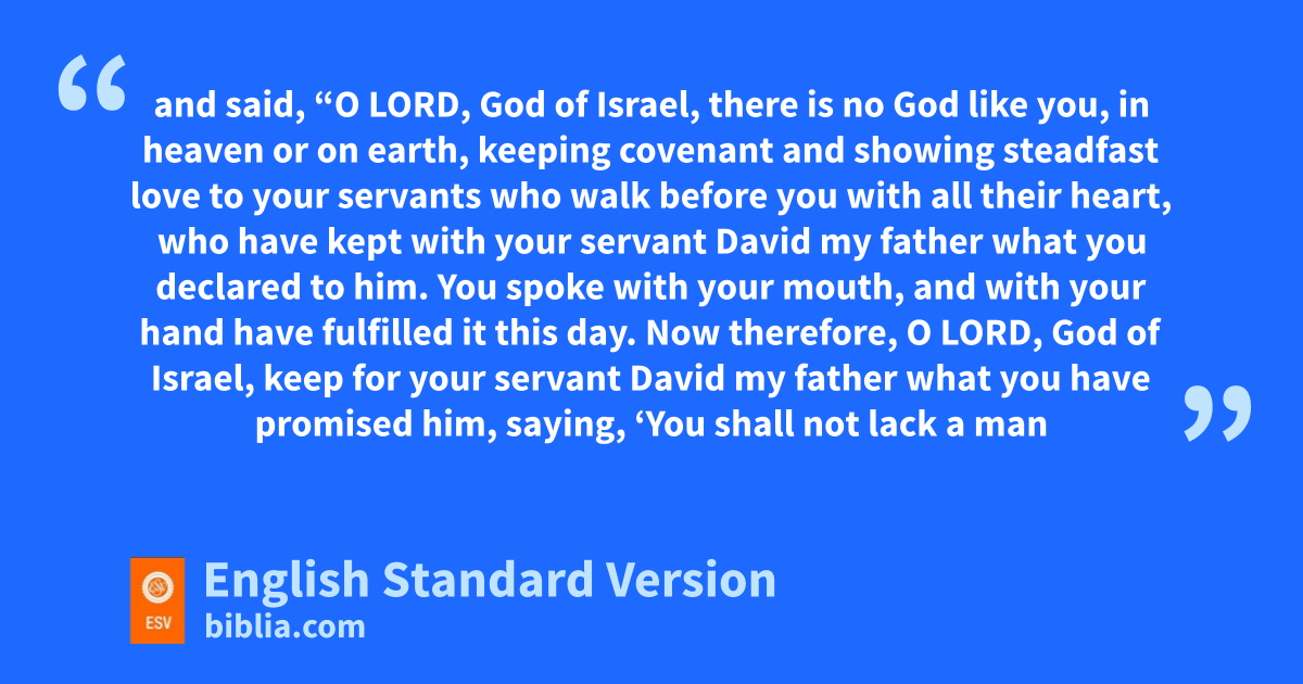 12 Then Solomon stood before the altar of the Lord in the presence of all the assembly of Israel and spread out his hands. 13 xSolomon had made a bronze platform five cubits1 long, five cubits wide, and three cubits high, and had set it in the court, and he stood on it. yThen he knelt on his knees in the presence of all the assembly of Israel, and spread out his hands toward heaven, 14 and said, “O Lord, God of Israel, zthere is no God like you, in heaven or on earth, akeeping covenant and showing steadfast love to your servants who walk before you with all their heart, 15 bwho have kept with your servant David my father what you declared to him. You spoke with your mouth, and with your hand have fulfilled it this day. 16 Now therefore, O Lord, God of Israel, keep for your servant David my father what you have promised him, saying, c‘You shall not lack a man to sit before me on the throne of Israel, dif only your sons pay close attention to their way, to walk in my law as you have walked before me.’ 17 Now therefore, O Lord, God of Israel, let your word be confirmed, which you have spoken to your servant David.