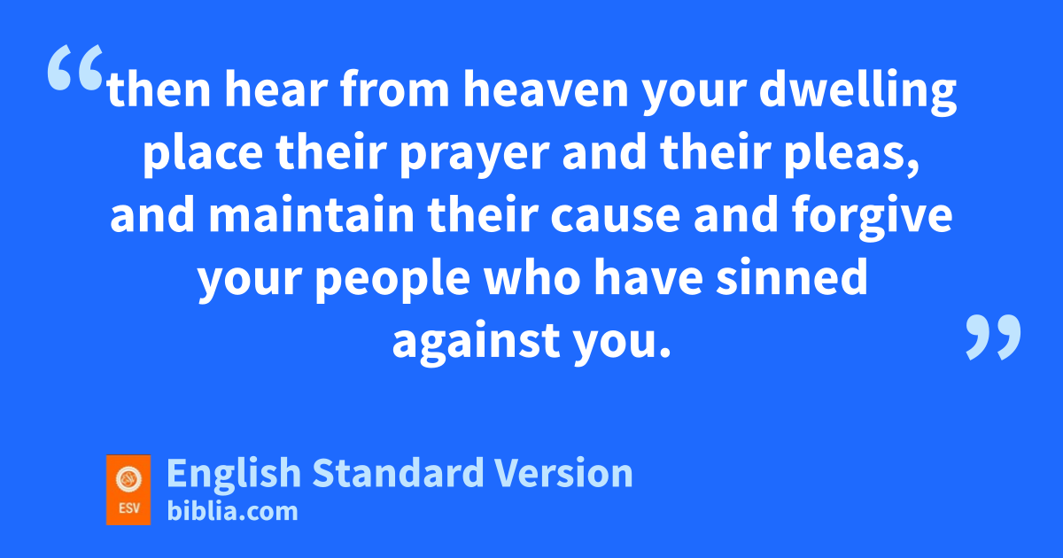 36 “If they sin against you—lfor there is no one who does not sin—and you are angry with them and give them to an enemy, so that they are carried away captive to a land far or near, 37 yet if they turn their heart in the land to which they have been carried captive, and repent and plead with you in the land of their captivity, saying, ‘We have sinned and have acted perversely and wickedly,’ 38 if they repent with all their heart and with all their soul in the land of their captivity to which they were carried captive, and pray toward their land, which you gave to their fathers, the city that you have chosen and the house that I have built for your name, 39 then hear from heaven your dwelling place their prayer and their pleas, and maintain their cause and forgive your people who have sinned against you. 40 Now, O my God, mlet your eyes be open nand your ears attentive to the prayer of this place.