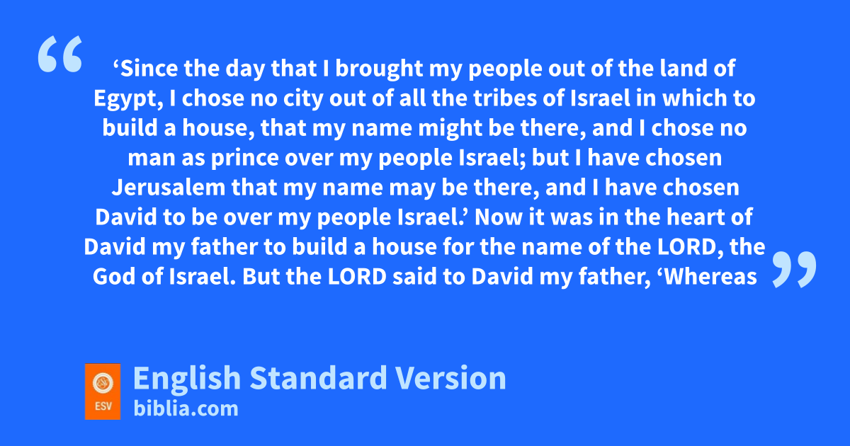 6 rThen Solomon said, “The Lord has said that he would dwell in thick darkness. 2 But I have built you san exalted house, a place for you to dwell in forever.” 3 Then the king turned around and blessed all the assembly of Israel, while all the assembly of Israel stood. 4 And he said, “Blessed be the Lord, the God of Israel, who with his hand has fulfilled what he promised with his mouth to David my father, saying, 5 ‘Since the day that I brought my people out of the land of Egypt, I chose no city out of all the tribes of Israel in which to build a house, that my name might be there, and I chose no man as prince over my people Israel; 6 tbut I have chosen Jerusalem that my name may be there, uand I have chosen David to be over my people Israel.’ 7 vNow it was in the heart of David my father to build a house for the name of the Lord, the God of Israel. 8 But the Lord said to David my father, ‘Whereas vit was in your heart to build a house for my name, you did well that it was in your heart. 9 Nevertheless, it is not you who shall build the house, but your son who shall be born to you shall build the house for my name.’ 10 Now the Lord has fulfilled his promise that he made. For I have risen in the place of David my father and sit on the throne of Israel, as the Lord promised, and I have built the house for the name of the Lord, the God of Israel. 11 And there I have set the ark, win which is the covenant of the Lord that he made with the people of Israel.”