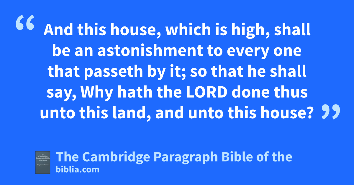 11 Thus nSolomon finished the house of the Lord, and the king’s house: and all that came into Solomon’s heart to make in the house of the Lord, and in his own house, he prosperously effected. 12 And the Lord appeared to Solomon by night, and said unto him, I have heard thy prayer, and ohave chosen this place to myself for a house of sacrifice. 13 pIf I shut up heaven that there be no rain, or if I command the qlocusts to devour the land, or if I send pestilence among my people; 14 if my people, * which are called by my name, shall rhumble themselves, and pray, and seek my face, and turn from their wicked ways; sthen will I hear from heaven, and will forgive their sin, and will heal their land. 15 tNow mine eyes shall be open, and mine ears attent * unto the prayer that is made in this place. 16 For now have uI chosen and sanctified this house, that my name may be there for ever: and mine eyes and mine heart shall be there perpetually. 17 And as for thee, if thou wilt walk before me, as David thy father walked, and do according to all that I have commanded thee, and shalt observe my statutes and my judgments; 18 then will I stablish the throne of thy kingdom, according as I have covenanted with David thy father, saying, * There shall not fail thee a man to be ruler in Israel. 19 wBut if ye turn away, and forsake my statutes and my commandments, which I have set before you, and shall go and serve other gods, and worship them; 20 then will I xpluck them up by the roots out of my land which I have given them; and this house, which I have sanctified for my name, will I cast out of my sight, and will make it to be a proverb and a byword among all nations. 21 And this house, which is high, shall be an astonishment to every one that passeth by it; so that he shall say, Why hath the Lord done thus unto this land, and unto this house? 22 And it shall be answered, Because they forsook the Lord God of their fathers, which brought them forth out of the land of Egypt, and laid hold on other gods, and worshipped them, and served them: therefore hath he brought all this evil upon them.