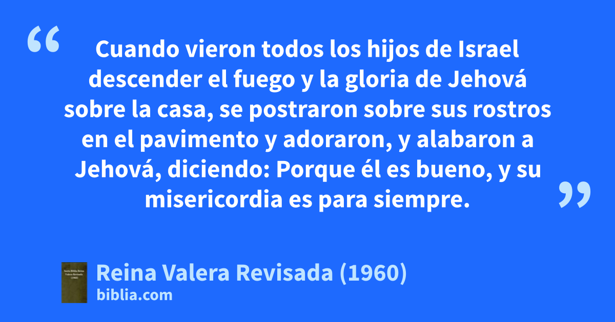 1Cuando Salomón acabó de orar, descendió fuego de los cielos, y consumió el holocausto y las víctimas;a y la gloria de Jehová llenó la casa. 2Y no podían entrar los sacerdotes en la casa de Jehová, porque la gloria de Jehová había llenado la casa de Jehová. 3Cuando vieron todos los hijos de Israel descender el fuego y la gloria de Jehová sobre la casa, se postraron sobre sus rostros en el pavimento y adoraron, y alabaron a Jehová, diciendo: Porque él es bueno, y su misericordia es para siempre.b
