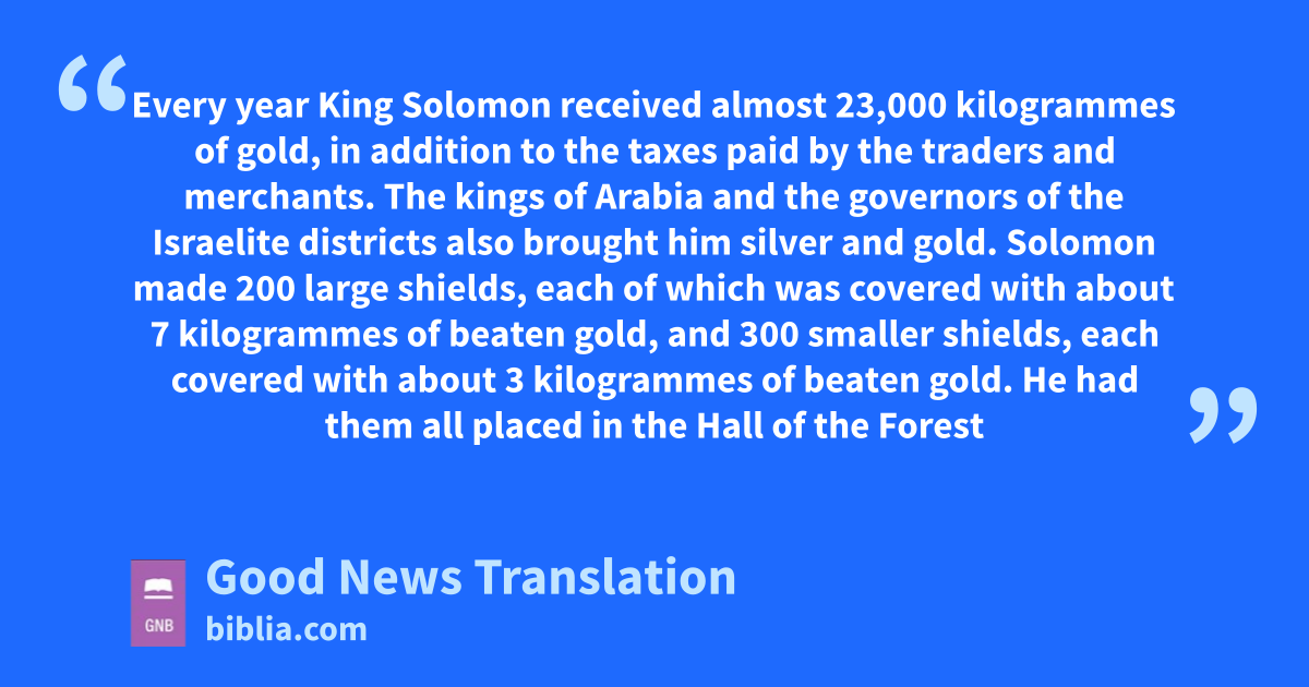 13 Every year King Solomon received almost 23,000 kilogrammes of gold, 14in addition to the taxes paid by the traders and merchants. The kings of Arabia and the governors of the Israelite districts also brought him silver and gold. 15Solomon made 200 large shields, each of which was covered with about 7 kilogrammes of beaten gold, 16and 300 smaller shields, each covered with about 3 kilogrammes of beaten gold. He had them all placed in the Hall of the Forest of Lebanon.r