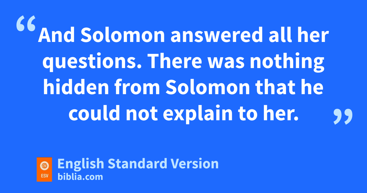 9 fNow when gthe queen of Sheba heard of the fame of Solomon, she came to Jerusalem to test him with hard questions, having a very great retinue and camels bearing spices and very much gold and precious stones. And when she came to Solomon, she told him all that was on her mind. 2 And Solomon answered all her questions. There was nothing hidden from Solomon that he could not explain to her. 3 And when gthe queen of Sheba had seen the wisdom of Solomon, the house that he had built, 4 the food of his table, the seating of his officials, and the attendance of his servants, and their clothing, his cupbearers, and their clothing, and his burnt offerings that he offered at the house of the Lord, there was no more breath in her.
