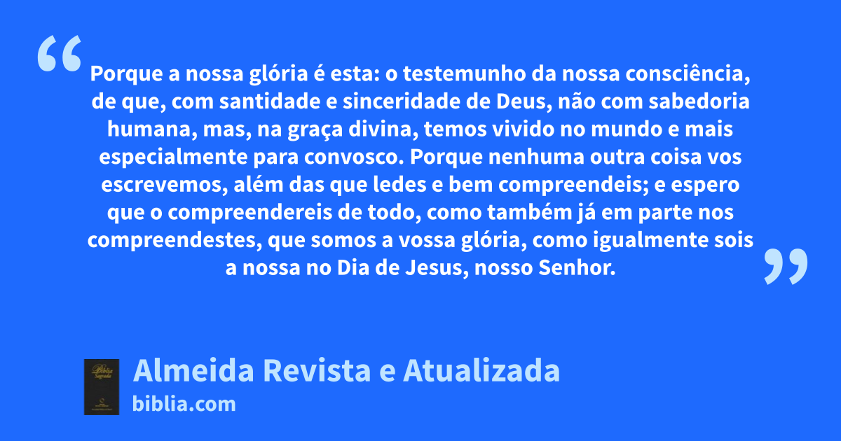 12 Porque a nossa glória é esta: o testemunho da nossa consciência, de que, com santidade e sinceridade de Deus, não com sabedoria humana, mas, na graça divina, temos vivido no mundo e mais especialmente para convosco. 13 Porque nenhuma outra coisa vos escrevemos, além das que ledes e bem compreendeis; e espero que o compreendereis de todo, 14 como também já em parte nos compreendestes, que somos a vossa glória, como igualmente sois a nossa no Dia de Jesus, nosso Senhor.