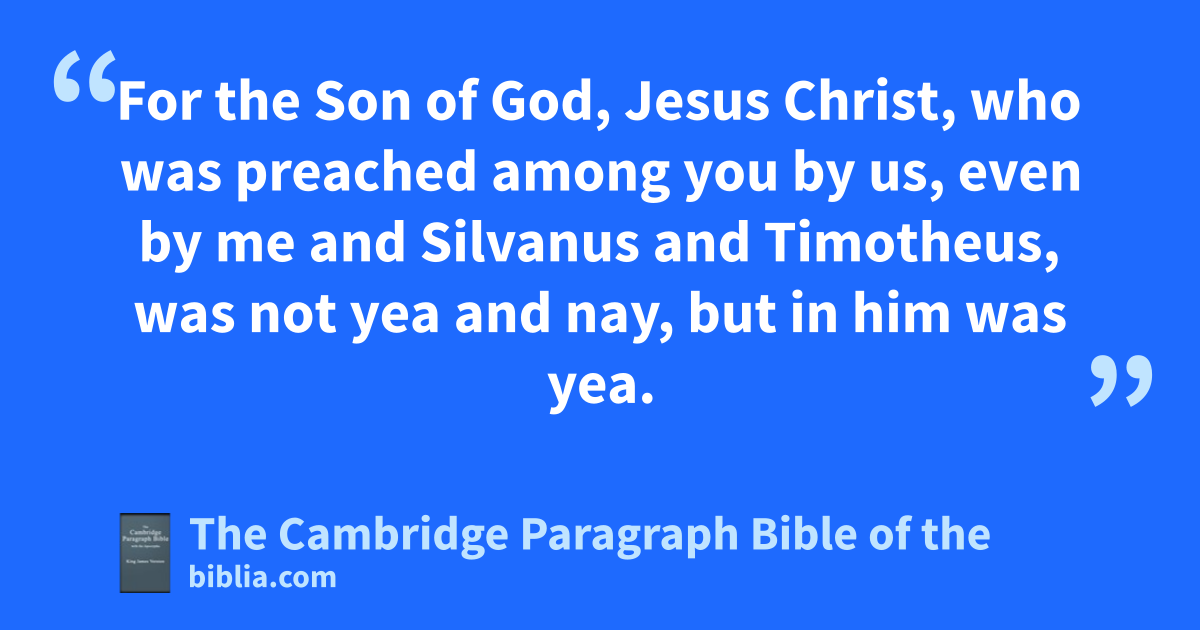 12 For our rejoicing is this, athe testimony of our conscience, that in bsimplicity and godly csincerity, dnot with fleshly wisdom, but by the grace of God, we have had our conversation in the world, and more abundantly to you-wards. 13 For we write none other things unto you, than what you read or acknowledge; and I trust you shall acknowledge even to the end; 14 as also you have acknowledged us ein part, that we are your frejoicing, even as ye also are ours gin the day of the Lord Jesus. 15 And in this confidence hI was minded to come unto you before, that you might have ia second * benefit; 16 and to pass by you into jMacedonia, and kto come again out of Macedonia unto you, and of you to be lbrought on my way toward Judea. 17 When I therefore was thus minded, did I use lightness? or the things that I purpose, do I purpose maccording to the flesh, that with me there should be yea yea, and nay nay? 18 But as God is true, our * nword toward you was not yea and nay. 19 For othe Son of God, Jesus Christ, who was preached among you by us, even by me and pSilvanus and qTimotheus, was not yea and nay, but rin him was yea. 20 For sall the promises of God in him are tyea, and in him Amen, unto the glory of God by us. 21 Now he which stablisheth us with you in Christ, and hath uanointed us, is God; 22 who hath also vsealed us, and wgiven the earnest of xthe Spirit in our hearts.
