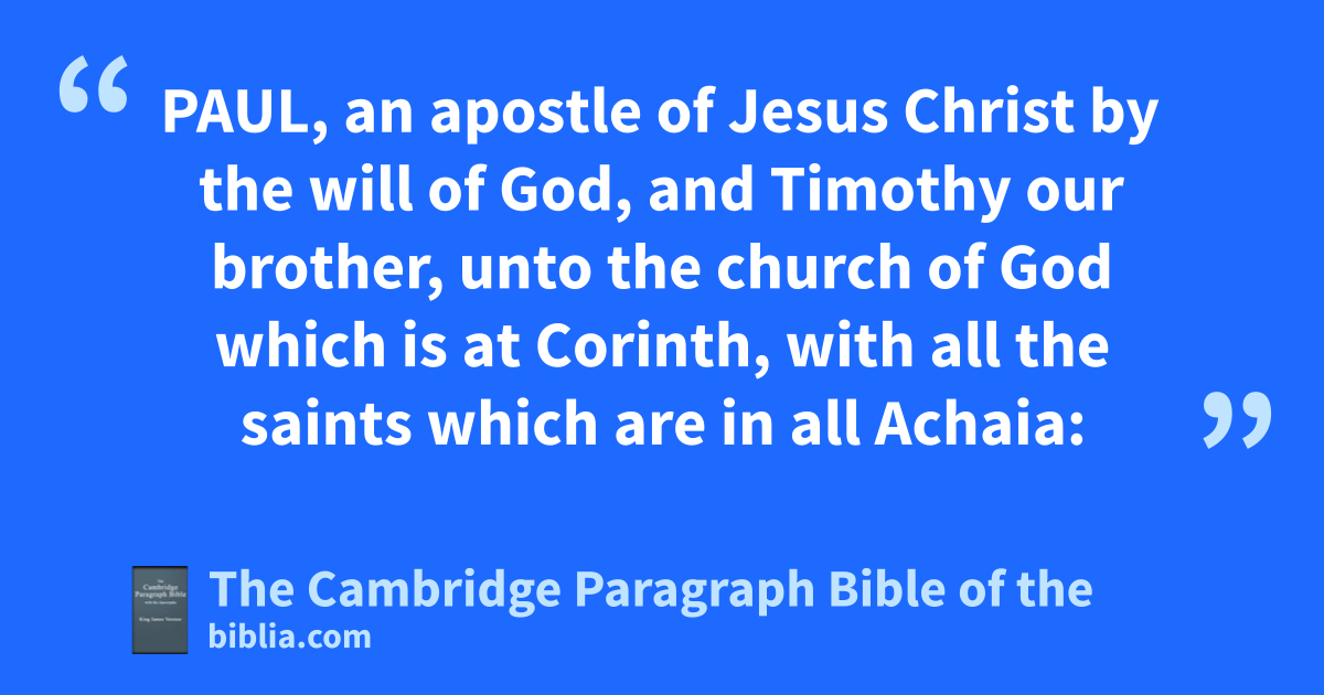 I. * Paul, aan apostle of Jesus Christ by the will of God, and bTimothy our brother, unto the church of God which is at cCorinth, dwith all the saints which are in all eAchaia: 2 fgrace be to you and peace from God our Father, and from the Lord Jesus Christ.