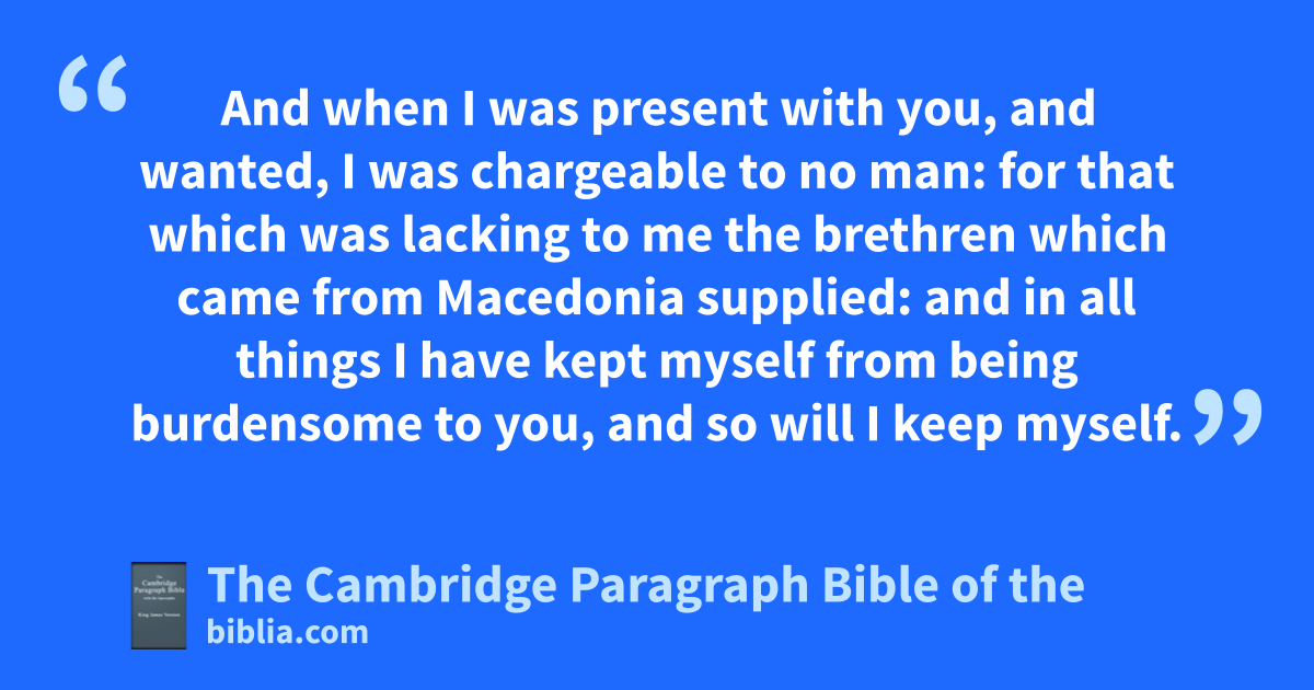 XI. Would to God you could abear with me a little in bmy folly: and indeed * abear with me. 2 For I am cjealous over you with godly jealousy: for dI have espoused you to one husband, efthat I may present you fas a chaste virgin to Christ. 3 But I fear, lest by any means, as gthe serpent hbeguiled Eve through his isubtilty, so your jminds kshould be corrupted from the lsimplicity that is in Christ. 4 For if mhe that cometh preacheth another Jesus, whom we have not preached, or if ye receive another spirit, which ye have not received, or nanother gospel, which ye have not accepted, ye might well abear * with him. 5 For I osuppose I was pnot a whit behind the very qchiefest apostles. 6 But rthough I be srude in speech, tyet not in knowledge; but ttwe have been throughly made manifest among you in all things. 7 Have I committed uan offence in vabasing myself that you might be exalted, because wI have preached to you the gospel of God xfreely? 8 I robbed other churches, taking ywages of them, to do you service. 9 And when I was present with you, and wanted, xzI was chargeable to no man: for that which was lacking to me athe brethren which came from bMacedonia supplied: and in all things cI have kept myself from being burdensome to you, and so will I keep myself. 10 dAs the truth of Christ is in me, * no man shall stop me of this fboasting in the gregions of hAchaia. 11 Wherefore? ibecause I love you not? kGod knoweth. 12 But what I do, that I will do, lthat I may cut off moccasion from them which desire moccasion; that wherein they glory, nthey may be found even as we. 13 For osuch are pfalse apostles, qdeceitful workers, rtransforming themselves into the apostles of Christ. 14 And no marvel; for sSatan himself is rtransformed into tan angel of light. 15 Therefore it is no great thing if uhis ministers also be rtransformed as vthe ministers of righteousness; wwhose end shall be according to their works.