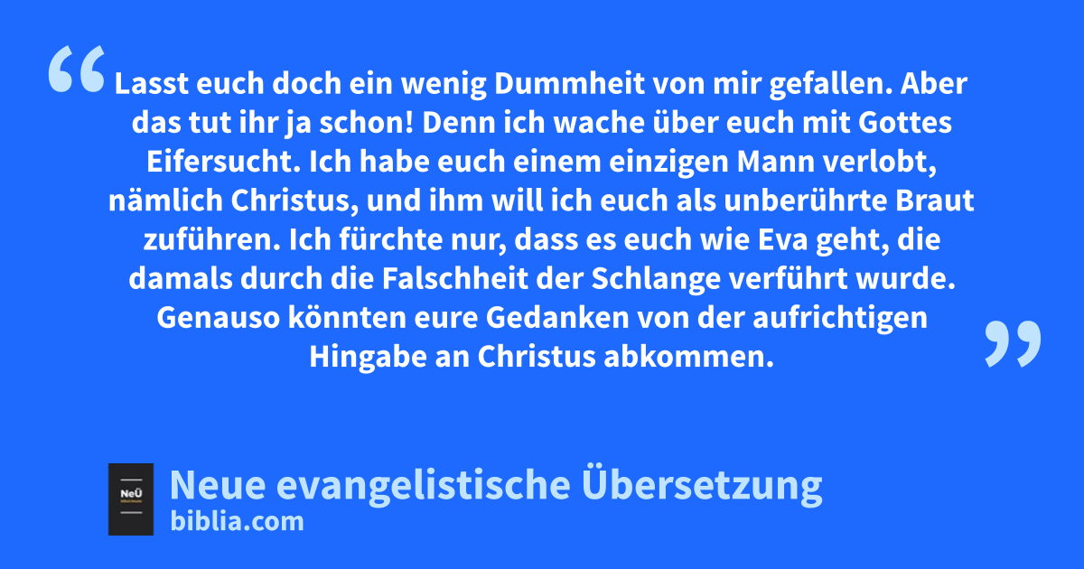 11 1 Lasst euch doch ein wenig Dummheit von mir gefallen. Aber das tut ihr ja schon! 2 Denn ich wache über euch mit Gottes Eifersucht. Ich habe euch einem einzigen Mann verlobt, nämlich Christus, und ihm will ich euch als unberührte Braut zuführen. 3 Ich fürchte nur, dass es euch wie Eva geht, die damals durch die Falschheit der Schlange verführt wurde. Genauso könnten eure Gedanken von der aufrichtigen Hingabe an Christus abkommen. 4 Denn wenn einer zu euch kommt und einen anderen Jesus predigt als den, den wir euch vorgestellt haben; und wenn ihr einen andersartigen Geist empfangt als den, den ihr erhalten habt, oder ein anderes Evangelium als das, das ihr angenommen habt, dann ertragt ihr das ganz gern. 5 Ich denke aber, dass ich nicht schlechter war als eure „Superapostel“. 6 Und wenn ich auch kein Meister in der Rede bin, so doch in der Erkenntnis. Das habe ich euch oft genug und in jeder Hinsicht bewiesen.