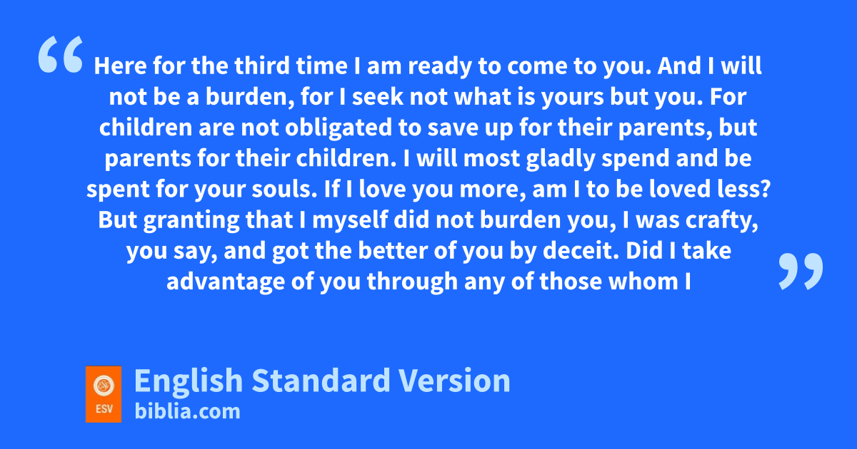14 Here vfor the third time I am ready to come to you. And I will not be a burden, for wI seek not what is yours but you. For xchildren are not obligated to save up for their parents, but yparents for their children. 15 zI will most gladly spend and be spent for your souls. If aI love you more, am I to be loved less? 16 But granting that bI myself did not burden you, I was crafty, you say, and got the better of you by deceit. 17 Did I take advantage of you cthrough any of those whom I sent to you? 18 dI urged Titus to go, and sent ethe brother with him. Did Titus take advantage of you? Did we not act in the same spirit? Did we not take the same steps?