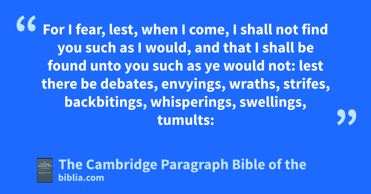 19 yAgain, think you that we excuse ourselves unto you? zwe speak before God in Christ: but we do aall things, dearly beloved, for your bedifying. 20 For I fear, lest, cwhen I come, I shall not find you such as I would, and that cI shall be found unto you such as ye would not: lest there be ddebates, denvyings, dwraths, dstrifes, ebackbitings, fwhisperings, swellings, gtumults: 21 and lest, hwhen I come again, my God will humble me among you, and that I shall bewail many iwhich have sinned already, and have not repented of the juncleanness and jkfornication and jllasciviousness which they have committed.