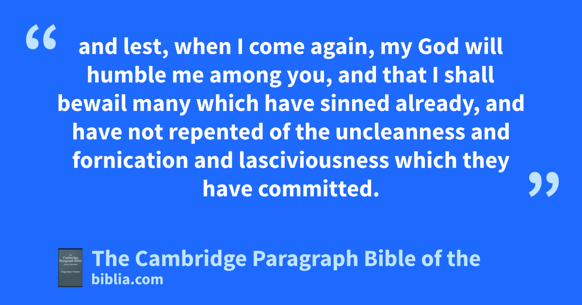 19 yAgain, think you that we excuse ourselves unto you? zwe speak before God in Christ: but we do aall things, dearly beloved, for your bedifying. 20 For I fear, lest, cwhen I come, I shall not find you such as I would, and that cI shall be found unto you such as ye would not: lest there be ddebates, denvyings, dwraths, dstrifes, ebackbitings, fwhisperings, swellings, gtumults: 21 and lest, hwhen I come again, my God will humble me among you, and that I shall bewail many iwhich have sinned already, and have not repented of the juncleanness and jkfornication and jllasciviousness which they have committed.