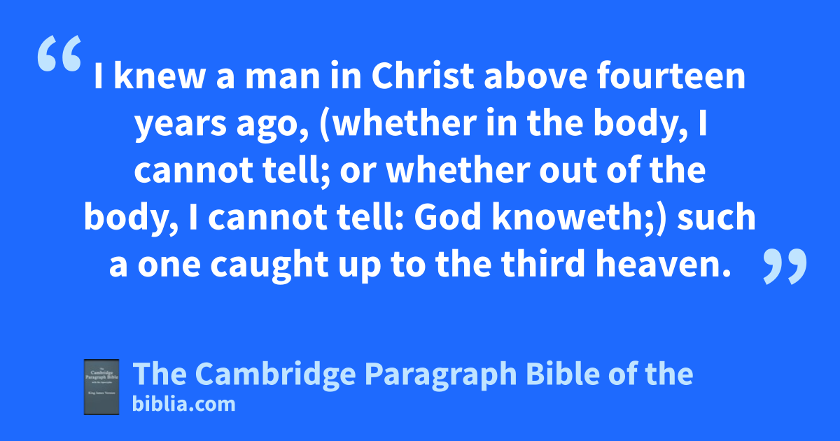 XII. It is not expedient for me doubtless to glory. * I will come to avisions and brevelations of the Lord. 2 I knew a man cin Christ above fourteen years ago, (whether in the body, I cannot tell; or whether out of the body, I cannot tell: dGod knoweth;) esuch a one fcaught up to gthe third heaven. 3 * And I knew such a man, (whether in the body, or out of the body, I cannot tell: dGod knoweth;) 4 how that he was fcaught up into hparadise, and heard unspeakable words, which it is not * ilawful for a man to utter. 5 Of such a one will I glory: yet kof myself I will not glory, lbut in mine infirmities. 6 For though I would desire to glory, mI shall not be a fool; for I will say the truth: but now nI forbear, lest any man should othink of me above that which he seeth me to be, or that he heareth of me. 7 And lest I should be exalted above measure through the abundance of the brevelations, lthere was given to me pa thorn in the flesh, qthe messenger of rSatan to sbuffet me, lest I should be exalted above measure. 8 For this thing I besought the Lord tthrice, that it might depart from me. 9 And he said unto me, My grace is sufficient for thee: for umy strength is made perfect in weakness. Most gladly therefore kwill I rather glory in my infirmities, that vthe power of Christ may rest upon me. 10 Therefore lI wtake pleasure in infirmities, in reproaches, in xznecessities, in ypersecutions, in zdistresses for Christ’s sake: afor when I am weak, then am I strong. 11 bI am become a fool in glorying; ye have compelled me: for I ought to have been ccommended of you: for din nothing am I behind the very chiefest apostles, ethough I be nothing. 12 Truly fthe signs of gan apostle were wrought among you hin all patience, fin isigns, and iwonders, and mighty deeds. 13 For jwhat is it wherein ye were inferior to other churches, except it be that kI myself lwas not burdensome to you? forgive me mthis wrong.