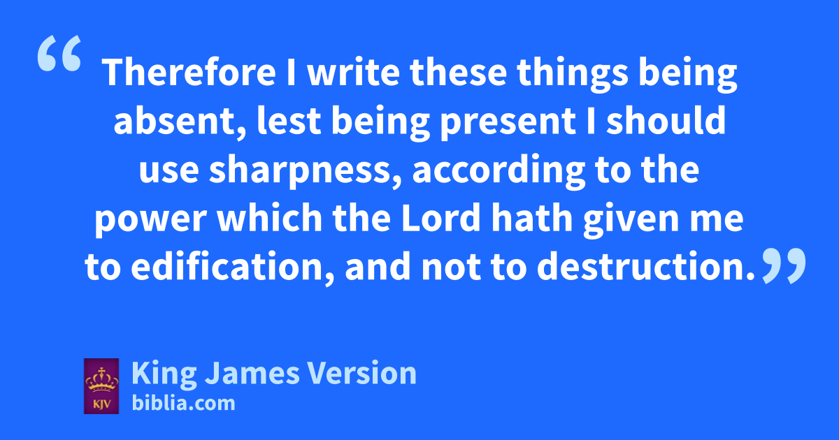 13 This is athe third time I am coming to you. bIn the mouth of two or three witnesses shall every word be established. 2 cI told you before, and foretell you, as if I were present, athe second time; and being absent now I write to them dwhich heretofore have sinned, and to all other, that, if I come again, eI will not fspare: 3 Since ye seek ga proof of Christ hspeaking in me, iwhich to you-ward is not weak, but jis mighty kin you. 4 For lthough he was crucified through weakness, yet mhe liveth jby the power of God. For nwe also are weak ||in him, but we shall live with him jby the power of God toward you. 5 Examine yourselves, whether ye be in the faith; oprove your own selves. Know ye not your own selves, how that pJesus Christ is in you, except ye be qreprobates? 6 But I trust that ye shall know that we are not qreprobates. 7 Now I pray to God that ye do no evil; not that rwe should appear approved, but that ye should do that which is honest, though we be as qreprobates. 8 For we can do nothing against the truth, but for the truth. 9 For we are glad, when swe are weak, and ye are strong: and this also we wish, even your tperfection. 10 Therefore I write these things being absent, ulest being present I should use wsharpness, according to xthe power which the Lord hath given me to xyedification, and not to xzdestruction.