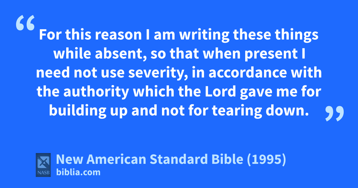 10 For this reason I am writing these things while absent, so that when present aI need not use bseverity, in accordance with the cauthority which the Lord gave me for building up and not for tearing down.
