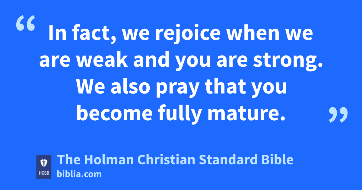 5 Test c yourselves to see if you are in the faith. Examine yourselves. Or do you yourselves not recognize that Jesus Christ is in you?—unless you fail the test. d 6 And I hope you will recognize that we do not fail the test. 7 Now we pray to God that you do nothing wrong—not that we may appear to pass the test, but that you may do what is right, e even though we may appear to fail. 8 For we are not able to do anything against the truth, f but only for the truth. 9 In fact, we rejoice when we are weak and you are strong. g We also pray that you become fully mature. h 10 This is why I am writing these things while absent, that when I am there I will not use severity, in keeping with the authority the Lord gave me for building up i and not for tearing down. j