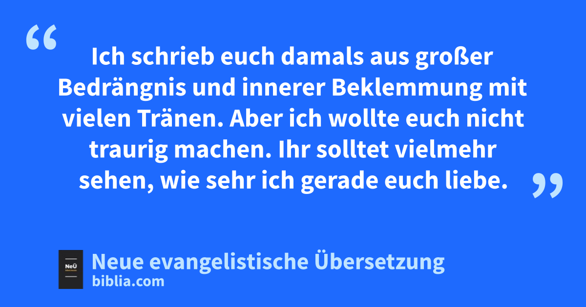 2 1 Ich entschloss mich also, nicht noch einmal zu euch zu kommen, wenn dadurch nur Traurigkeit entsteht. 2 Denn wenn ich euch Kummer bereite, wer soll mich dann wieder froh machen? Etwa der, der durch mich betrübt wurde? 3 Genau das habe ich euch ja geschrieben. Ich wollte nicht kommen und erleben, dass die, die mir eigentlich Freude bereiten sollten, mich traurig machen. Denn ich bin sicher, dass ihr euch freut, wenn ich mich freuen kann. 4 Ich schrieb euch damals aus großer Bedrängnis und innerer Beklemmung mit vielen Tränen. Aber ich wollte euch nicht traurig machen. Ihr solltet vielmehr sehen, wie sehr ich gerade euch liebe.