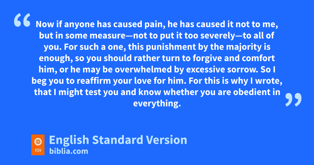 5 Now yif anyone has caused pain, zhe has caused it not to me, but ain some measure—not to put it too severely—to all of you. 6 For such a one, bthis punishment by the majority is enough, 7 so cyou should rather turn to forgive and comfort him, or he may be overwhelmed by excessive sorrow. 8 So I beg you to reaffirm your love for him. 9 For this is why I wrote, that I might dtest you and know ewhether you are obedient in everything. 10 Anyone whom you forgive, I also forgive. Indeed, what I have forgiven, if I have forgiven anything, has been for your sake in the presence of Christ, 11 so that we would not be outwitted by Satan; for fwe are not ignorant of his designs.