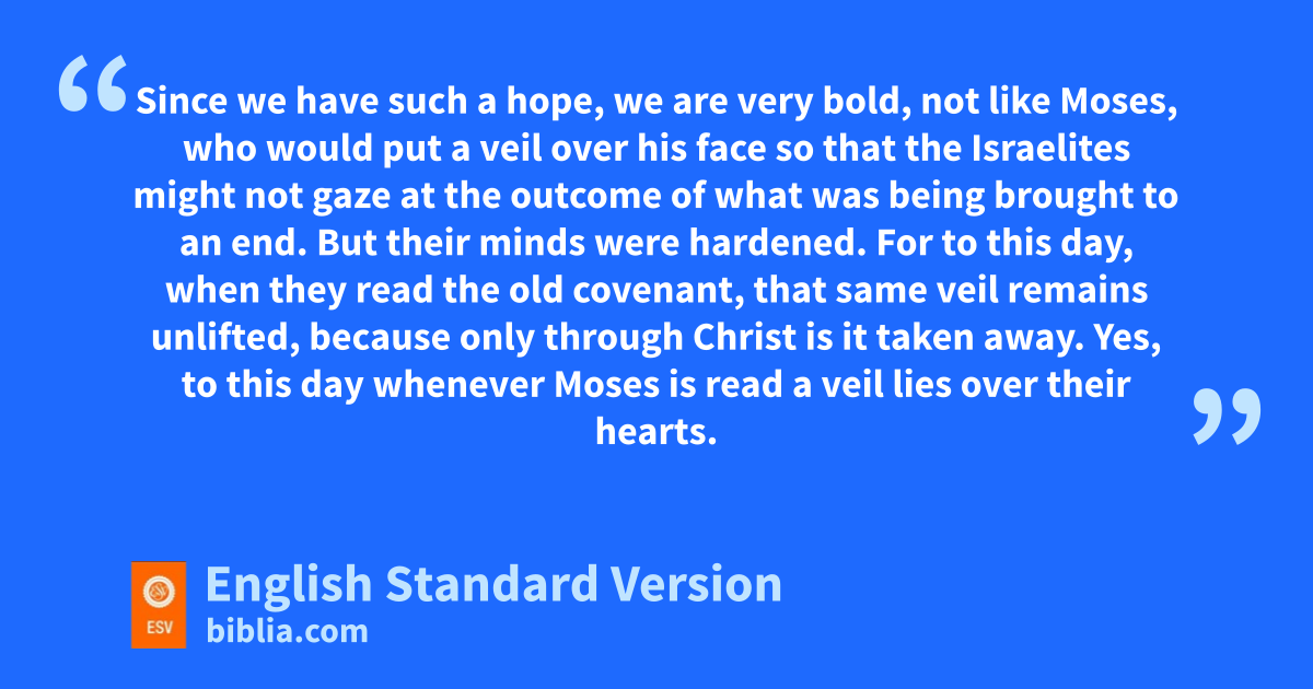 12 Since we have such a hope, jwe are very bold, 13 not like Moses, kwho would put a veil over his face so that the Israelites might not gaze at the outcome of what was being brought to an end. 14 But ltheir minds were mhardened. For to this day, nwhen they read othe old covenant, that same veil remains unlifted, because only through Christ is it taken away. 15 Yes, to this day whenever Moses is read a veil lies over their hearts. 16 But when pone3 turns to the Lord, qthe veil is removed. 17 Now the Lord4 is the Spirit, and where rthe Spirit of the Lord is, there is sfreedom. 18 And we all, with unveiled face, tbeholding uthe glory of the Lord,5 vare being transformed into the same image wfrom one degree of glory to another.6 For this comes from the Lord who is the Spirit.