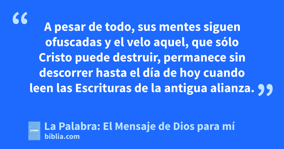 12 Con una esperanza así, ¿no vamos a actuar con plena libertad? 13 Pues no es nuestro caso el de Moisés, que se cubría el rostro con un velo para evitar que los israelitas contemplaran el apagarse de un resplandor perecedero. 14 A pesar de todo, sus mentes siguen ofuscadas y el velo aquel, que sólo Cristo puede destruir, permanece sin descorrer hasta el día de hoy cuando leen las Escrituras de la antigua alianza. 15 Hasta hoy, efectivamente, un velo nubla su mente siempre que leen a Moisés; 16 sólo cuando se conviertan al Señor, desaparecerá el velo. 17 Y es que el Señor es el Espíritu, y donde está el Espíritu del Señor hay libertad. 18 En cuanto a nosotros, llevando todos el rostro descubierto y reflejando la gloria del Señor, vamos incorporando su imagen cada vez más resplandeciente bajo el influjo del Espíritu del Señor.