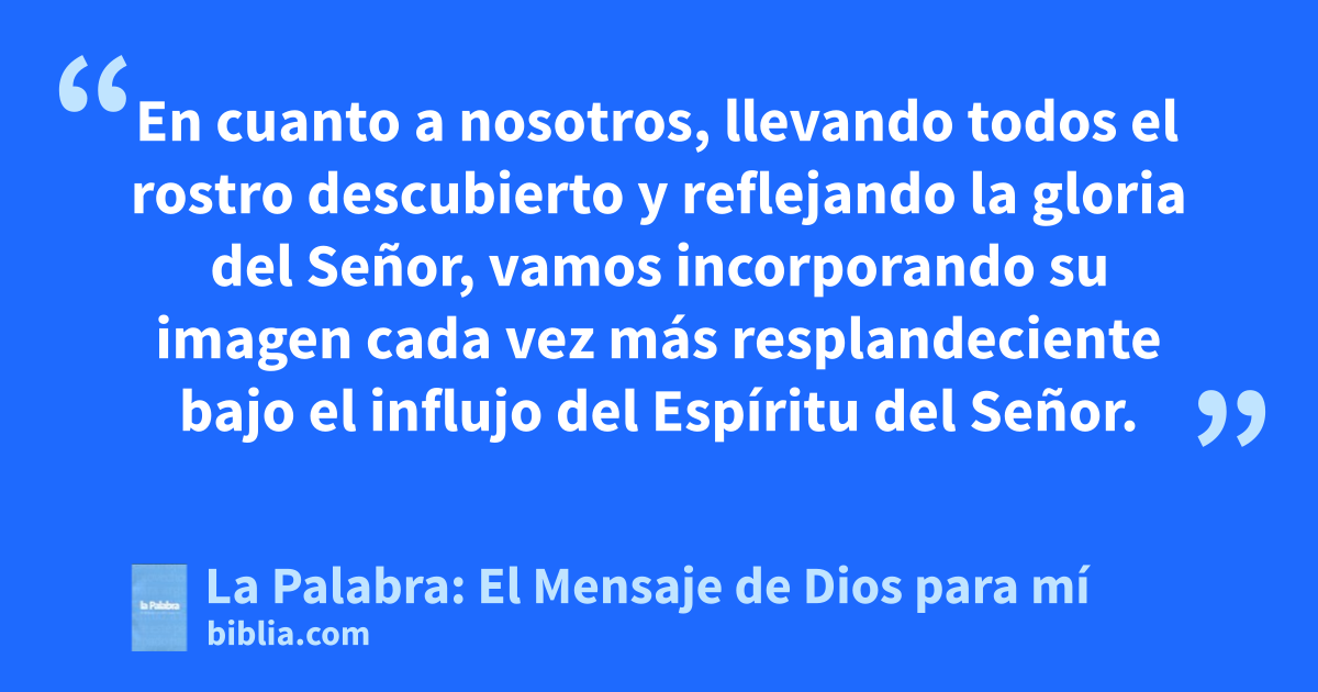 12 Con una esperanza así, ¿no vamos a actuar con plena libertad? 13 Pues no es nuestro caso el de Moisés, que se cubría el rostro con un velo para evitar que los israelitas contemplaran el apagarse de un resplandor perecedero. 14 A pesar de todo, sus mentes siguen ofuscadas y el velo aquel, que sólo Cristo puede destruir, permanece sin descorrer hasta el día de hoy cuando leen las Escrituras de la antigua alianza. 15 Hasta hoy, efectivamente, un velo nubla su mente siempre que leen a Moisés; 16 sólo cuando se conviertan al Señor, desaparecerá el velo. 17 Y es que el Señor es el Espíritu, y donde está el Espíritu del Señor hay libertad. 18 En cuanto a nosotros, llevando todos el rostro descubierto y reflejando la gloria del Señor, vamos incorporando su imagen cada vez más resplandeciente bajo el influjo del Espíritu del Señor.