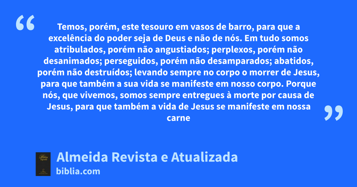 7 Temos, porém, este tesouro em vasos de barro, para que a excelência do poder seja de Deus e não de nós. 8 Em tudo somos atribulados, porém não angustiados; perplexos, porém não desanimados; 9 perseguidos, porém não desamparados; abatidos, porém não destruídos; 10 levando sempre no corpo o morrer de Jesus, para que também a sua vida se manifeste em nosso corpo. 11 Porque nós, que vivemos, somos sempre entregues à morte por causa de Jesus, para que também a vida de Jesus se manifeste em nossa carne mortal. 12 De modo que, em nós, opera a morte, mas, em vós, a vida. 13 Tendo, porém, o mesmo espírito da fé, como está escrito: