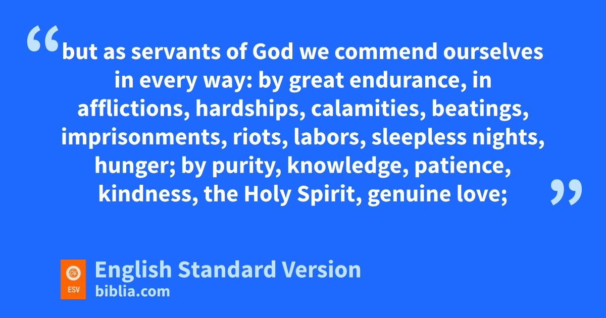 Behold, xnow is the yfavorable time; behold, now is the day of salvation. 3 We zput no obstacle in anyone’s way, so that no fault may be found with our ministry, 4 but aas servants of God we commend ourselves in every way: bby great endurance, cin afflictions, dhardships, calamities, 5 ebeatings, imprisonments, friots, labors, sleepless nights, hunger; 6 gby purity, hknowledge, patience, kindness, ithe Holy Spirit, jgenuine love; 7 by ktruthful speech, and lthe power of God; with mthe weapons of righteousness for the right hand and for the left; 8 through honor and dishonor, nthrough slander and praise. We are treated as impostors, and yet are true; 9 as unknown, and oyet well known; pas dying, and behold, we live; qas punished, and yet not killed; 10 ras sorrowful, yet always rejoicing; sas poor, yet making many rich; tas having nothing, uyet possessing everything.